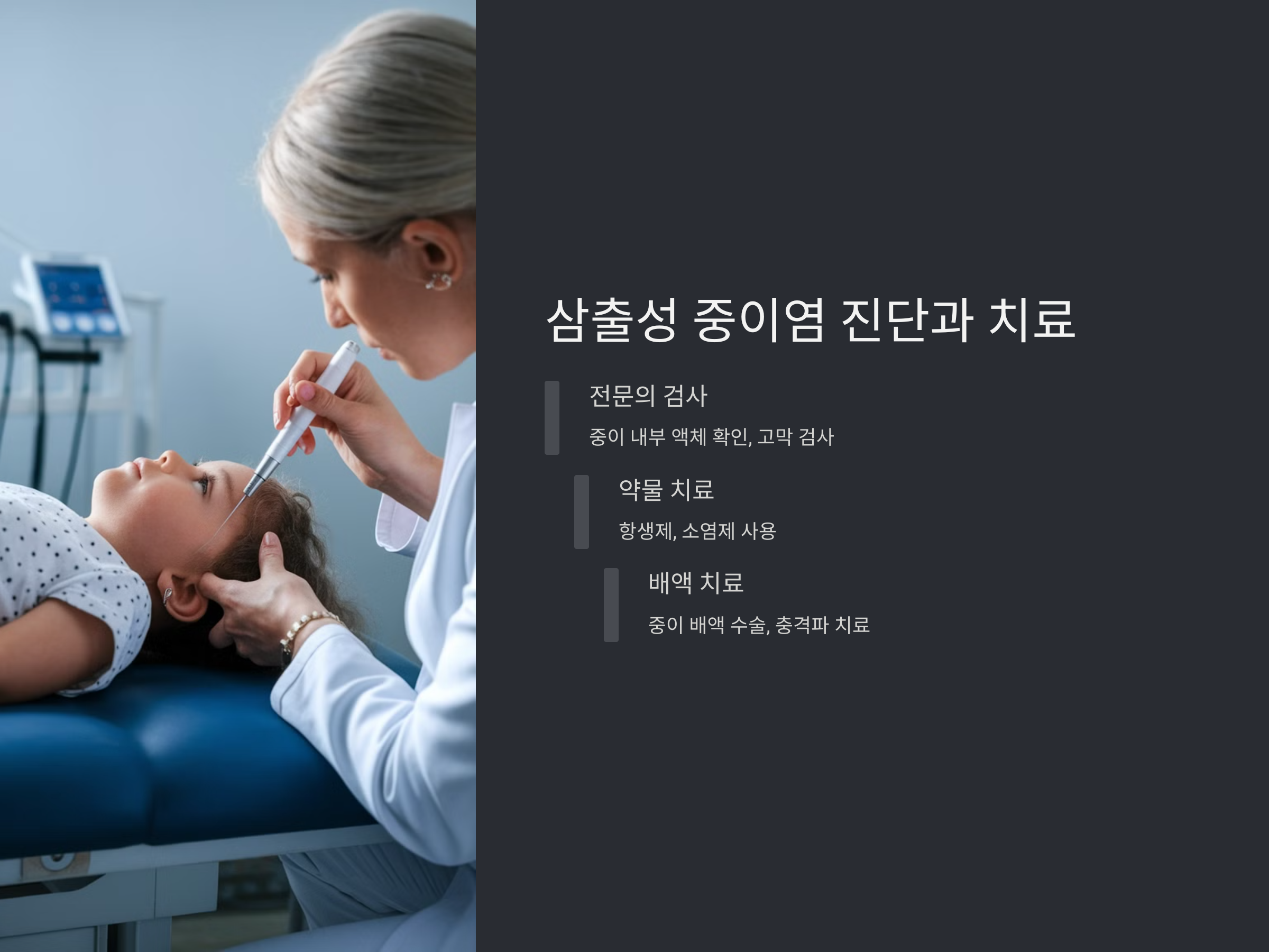 삼출성 중이염의 진단은 이비인후과 전문의의 검사를 통해 이루어집니다. 중이 내부의 액체 축적 여부를 확인하고, 청력 검사나 고막 검사를 통해 상태를 점검할 수 있습니다.