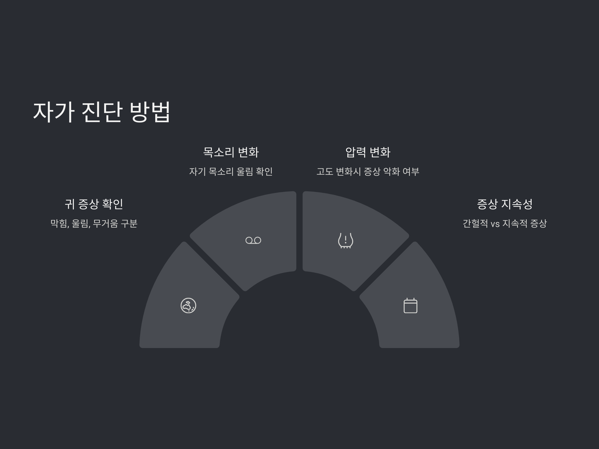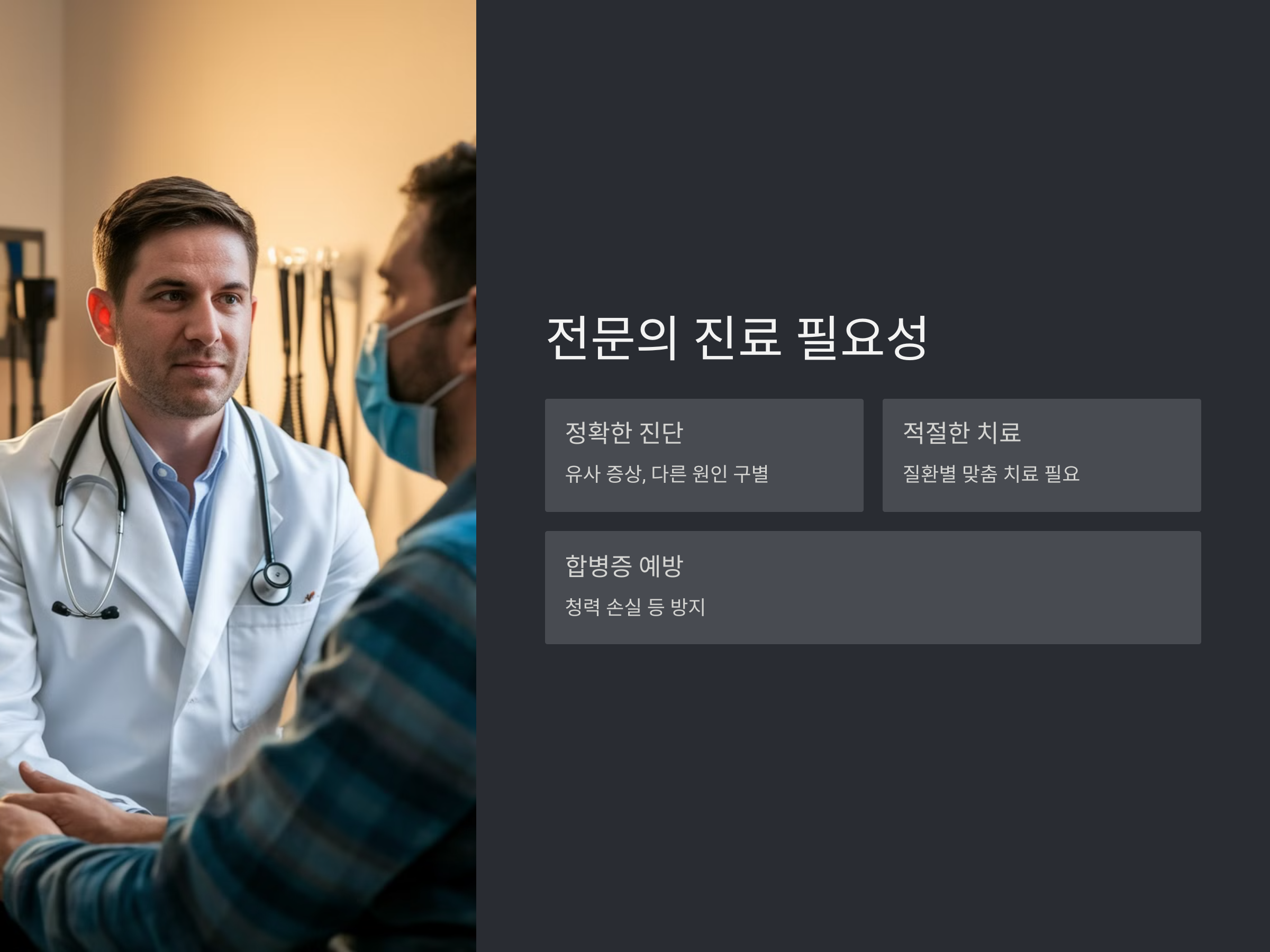 따라서 정확한 진단을 위해서는 이비인후과 전문의의 진료를 받는 것이 중요합니다. 증상에 따라 적절한 치료 방법을 선택하고, 병의 진행을 방지하는 것이 가장 중요합니다.