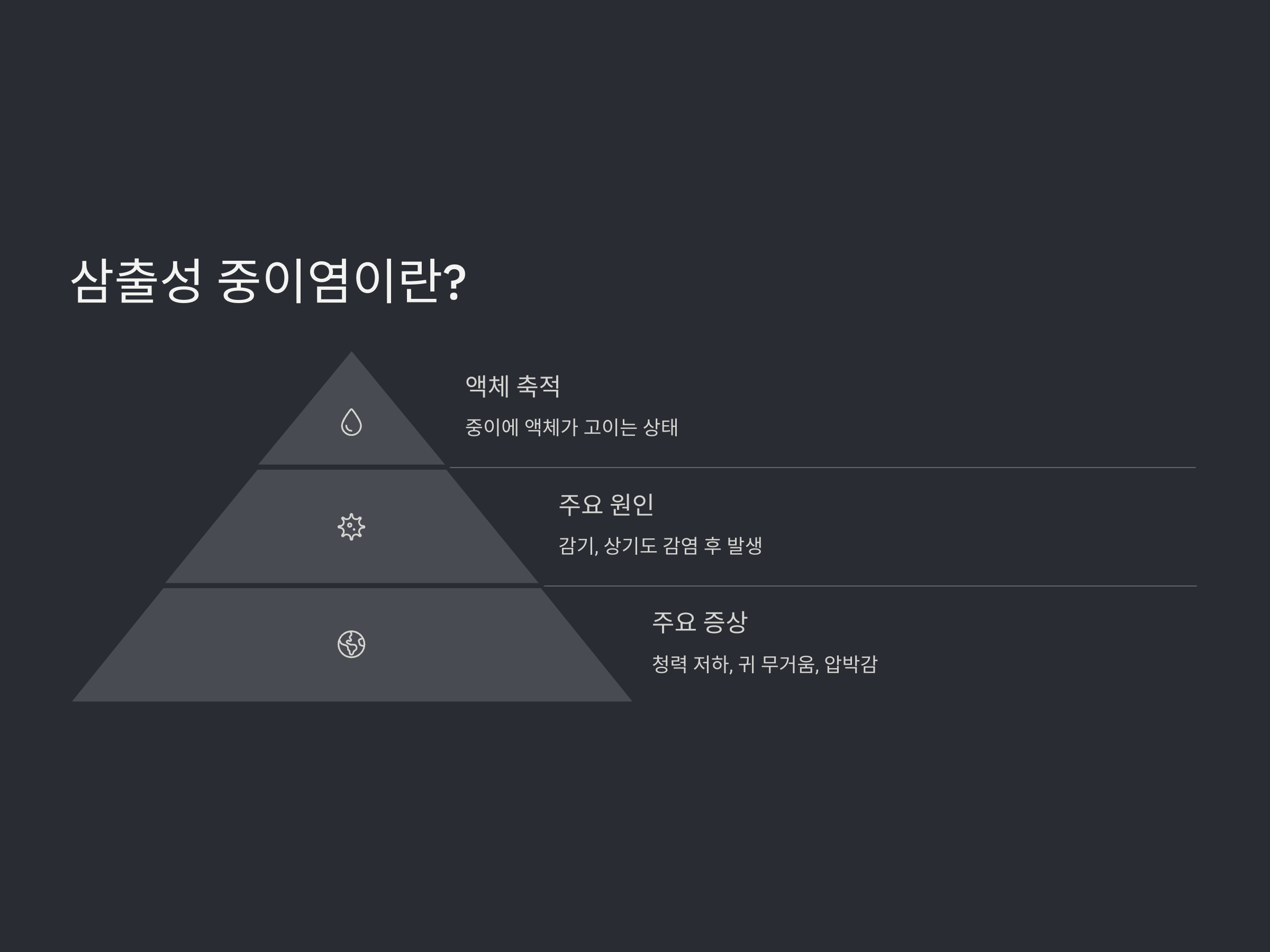- 삼출성 중이염은 액체가 중이에 축적되어 귀에 무거운 느낌이나 청력 저하를 유발하며, 염증과 감염이 원인인 경우가 많습니다.