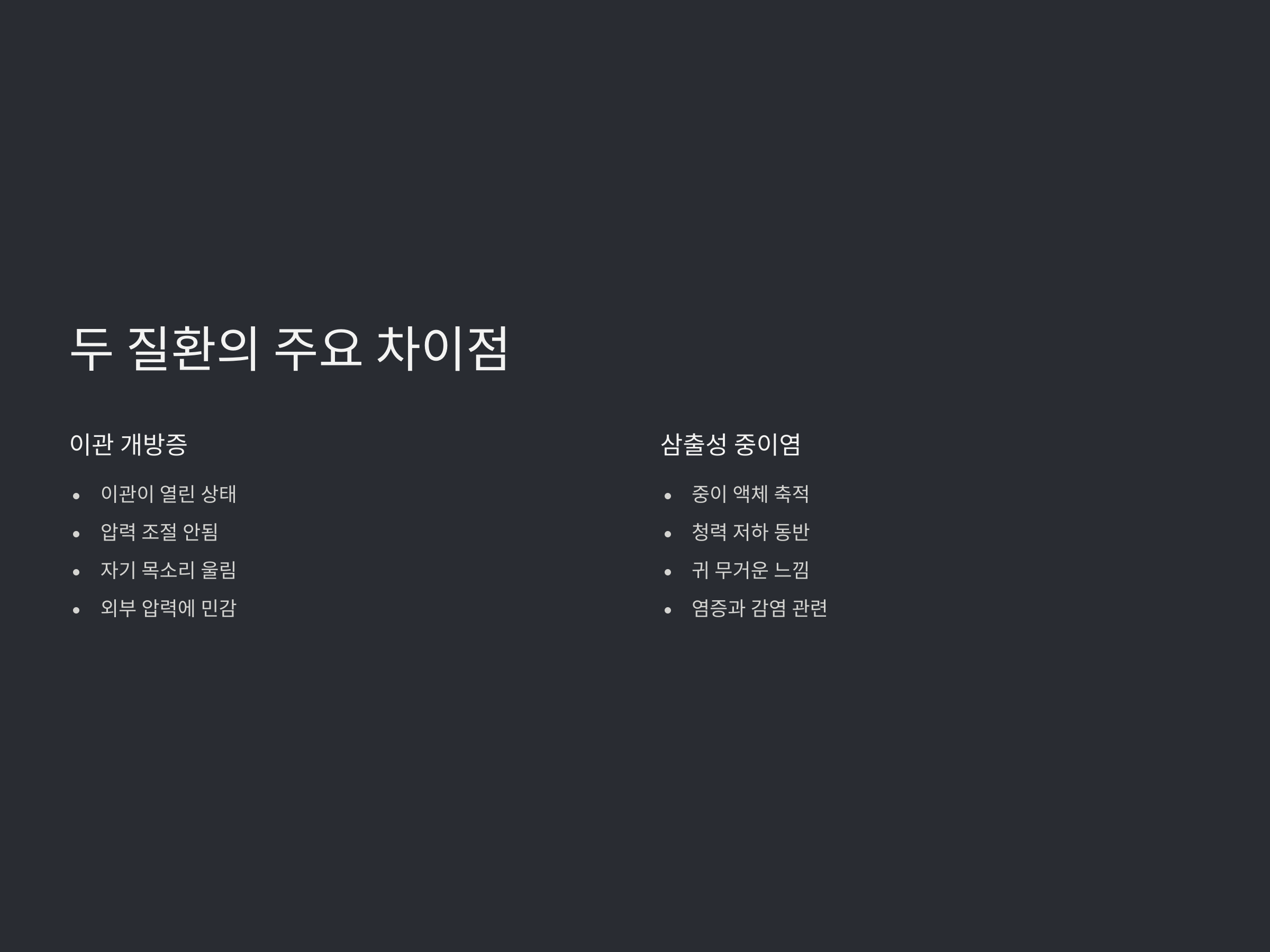 이관 개방증과 삼출성 중이염은 증상 면에서 비슷한 점이 있지만, 그 원인과 치료 방법에서는 큰 차이를 보입니다. 주요 차이점은 다음과 같습니다: