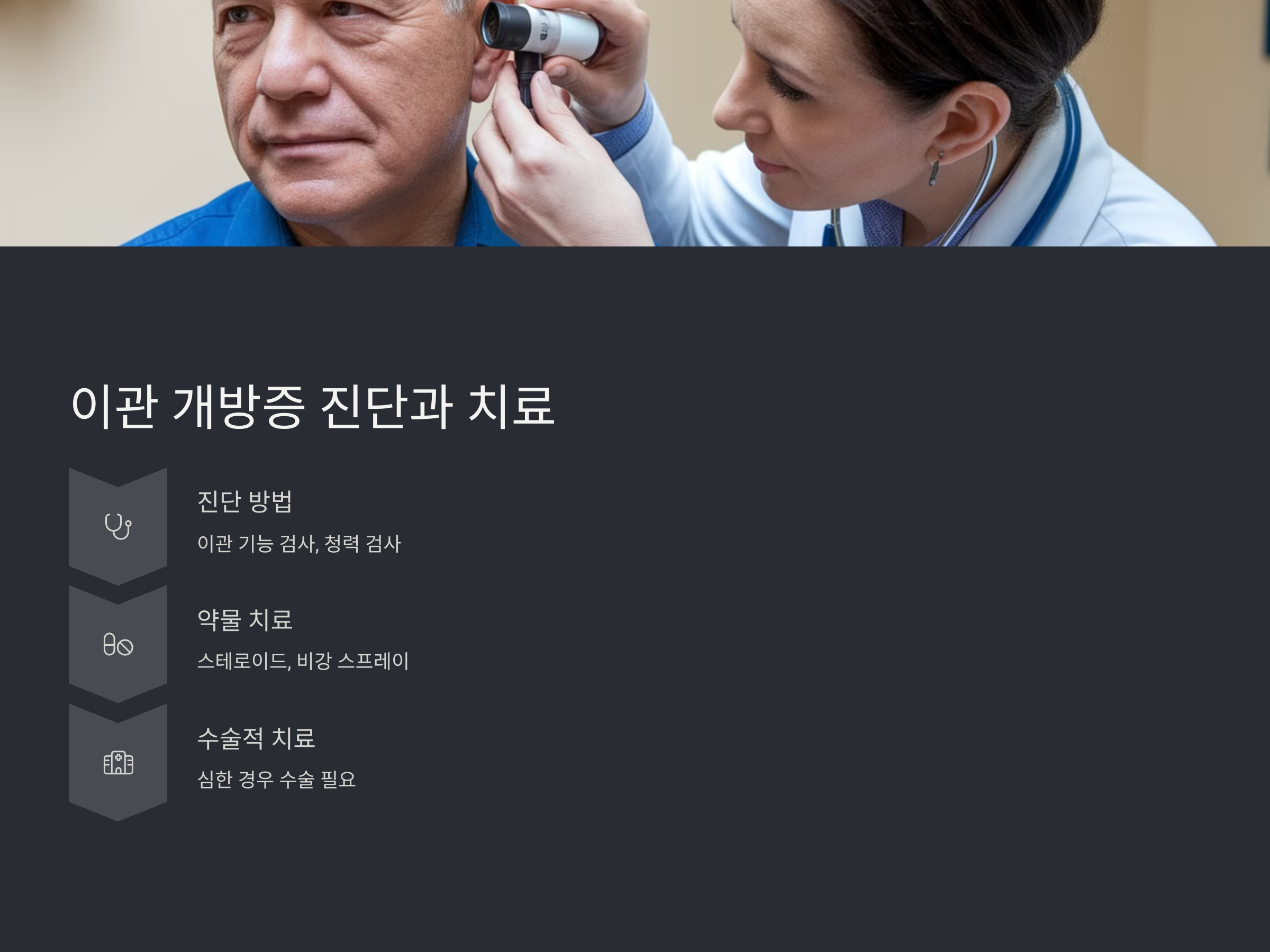 치료는 대개 자연적으로 회복되기도 하며, 경우에 따라 약물 치료나 이관 기능을 개선하는 치료가 필요할 수 있습니다. 스테로이드 약물이나 비강 스프레이가 도움이 될 수 있으며, 수술적 치료가 필요한 경우도 있습니다.