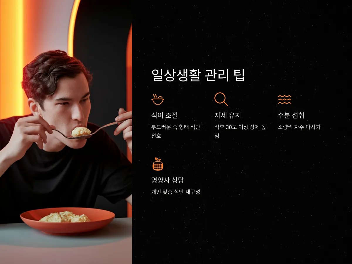 치료와 병행하여 일상에서도 몇 가지 점을 유의해야 증상의 악화를 막을 수 있습니다. 첫째, 음식을 꼭꼭 씹어 천천히 삼키는 습관이 중요합니다. 둘째, 너무 뜨겁거나 찬 음식, 자극적인 음식은 피하고, 부드러운 죽 형태의 식단을 선호하는 것이 좋습니다.