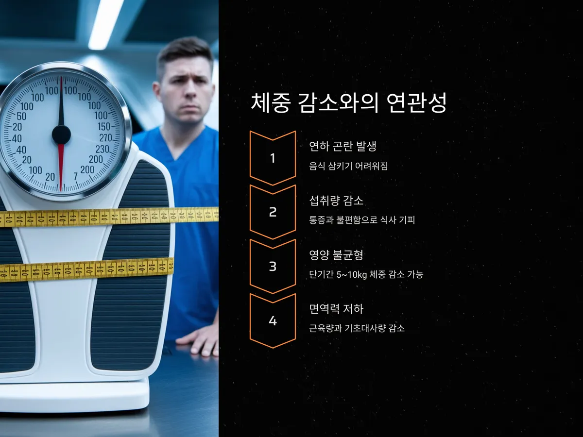 체중 감소는 식도 협착 환자들이 가장 흔히 겪는 2차 증상 중 하나입니다. 연하 곤란으로 인해 음식을 삼키는 것이 점점 힘들어지면서 섭취량 자체가 줄어들게 됩니다. 또한, 협착이 심해질수록 환자들은 통증이나 구토를 피하기 위해 식사 자체를 기피하게 되어 영양 불균형이 심화됩니다.