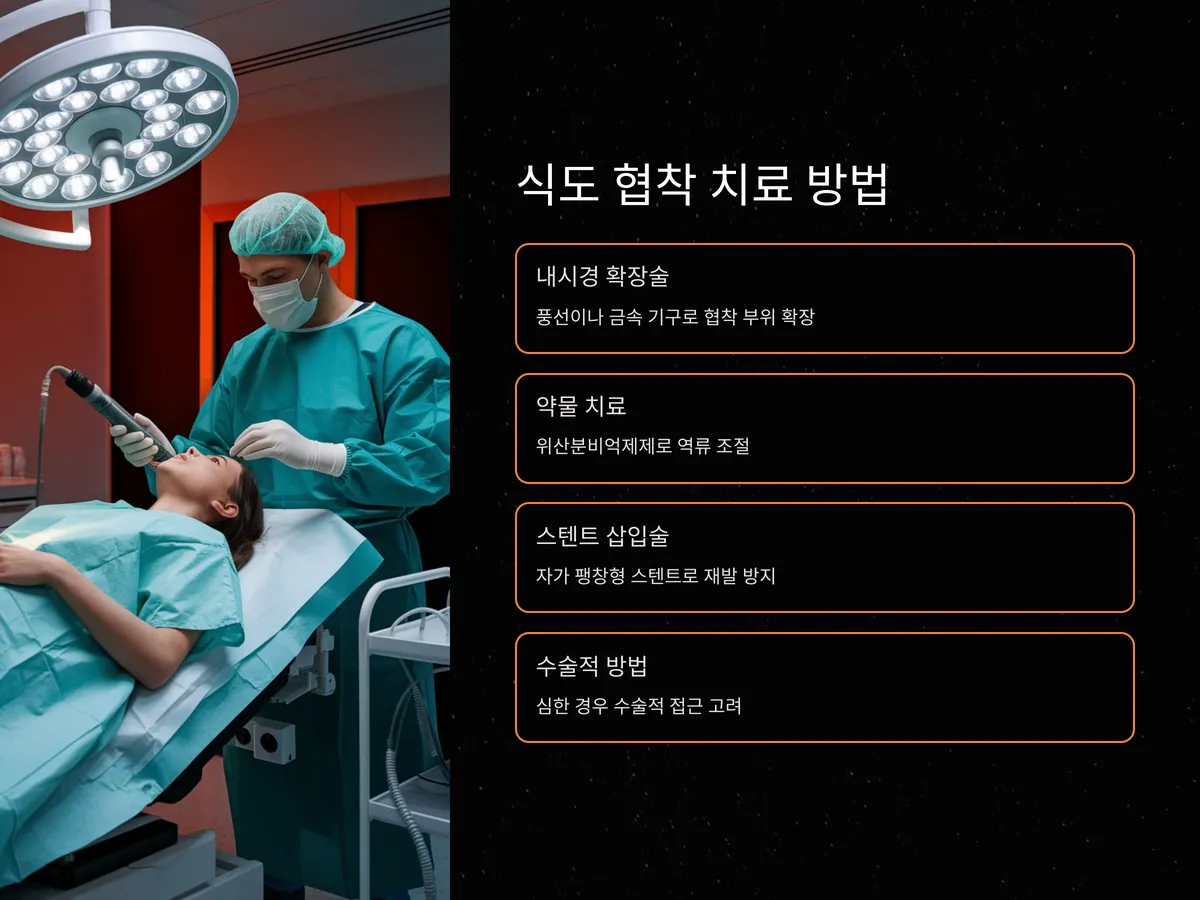 식도 협착 치료는 원인에 따라 달라지지만, 주로 사용되는 방법은 다음과 같습니다. 첫째, 내시경을 이용한 식도 확장술이 가장 일반적이며, 협착된 부위를 풍선이나 금속 기구로 넓히는 시술입니다. 둘째, 원인이 되는 위식도역류를 치료하기 위해 위산분비억제제를 사용하며, 필요시 수술적 방법도 고려됩니다.