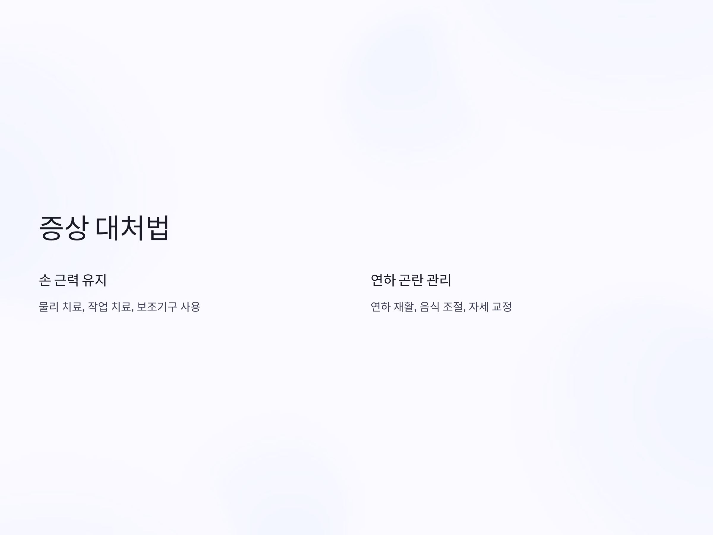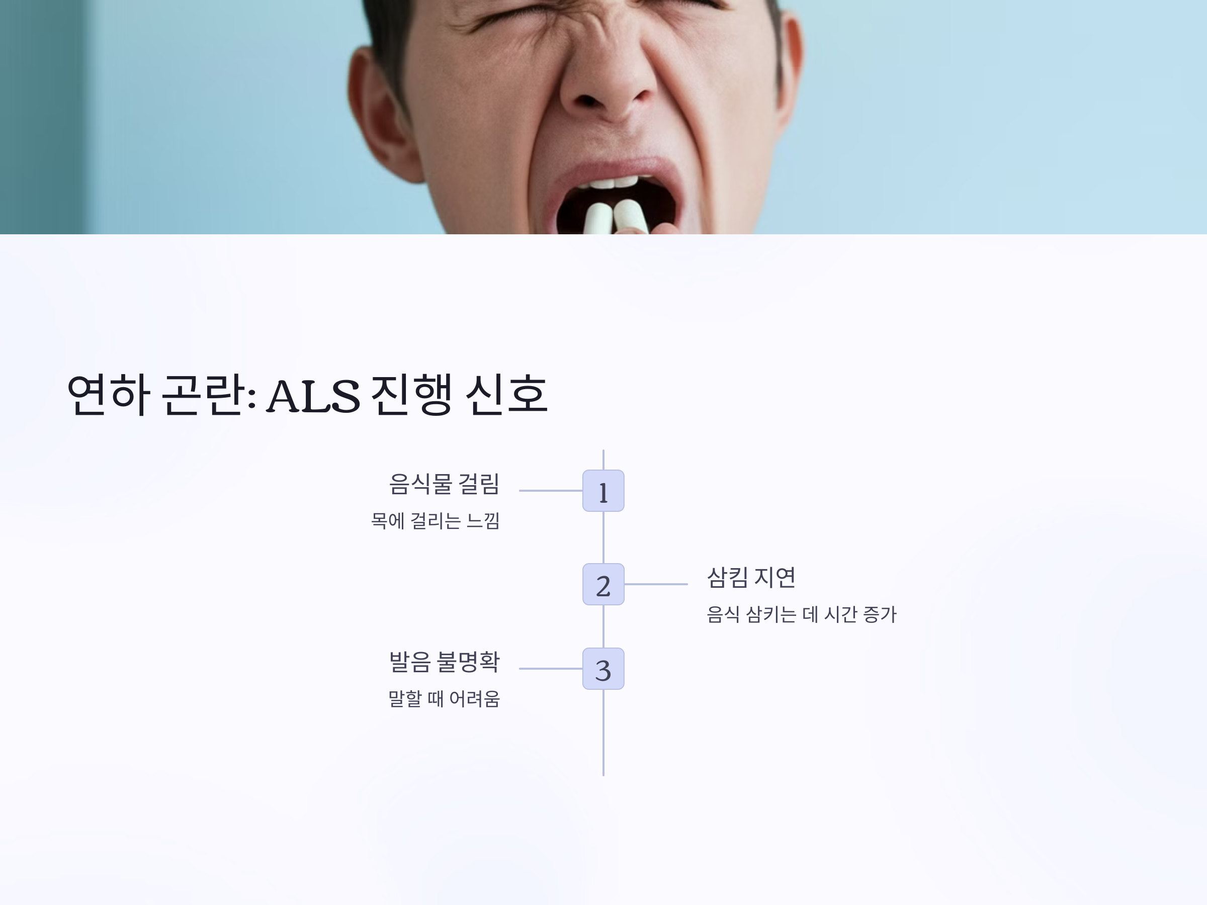 - 연하 곤란: 질병이 진행되면서 음식물 삼키기 어려워짐