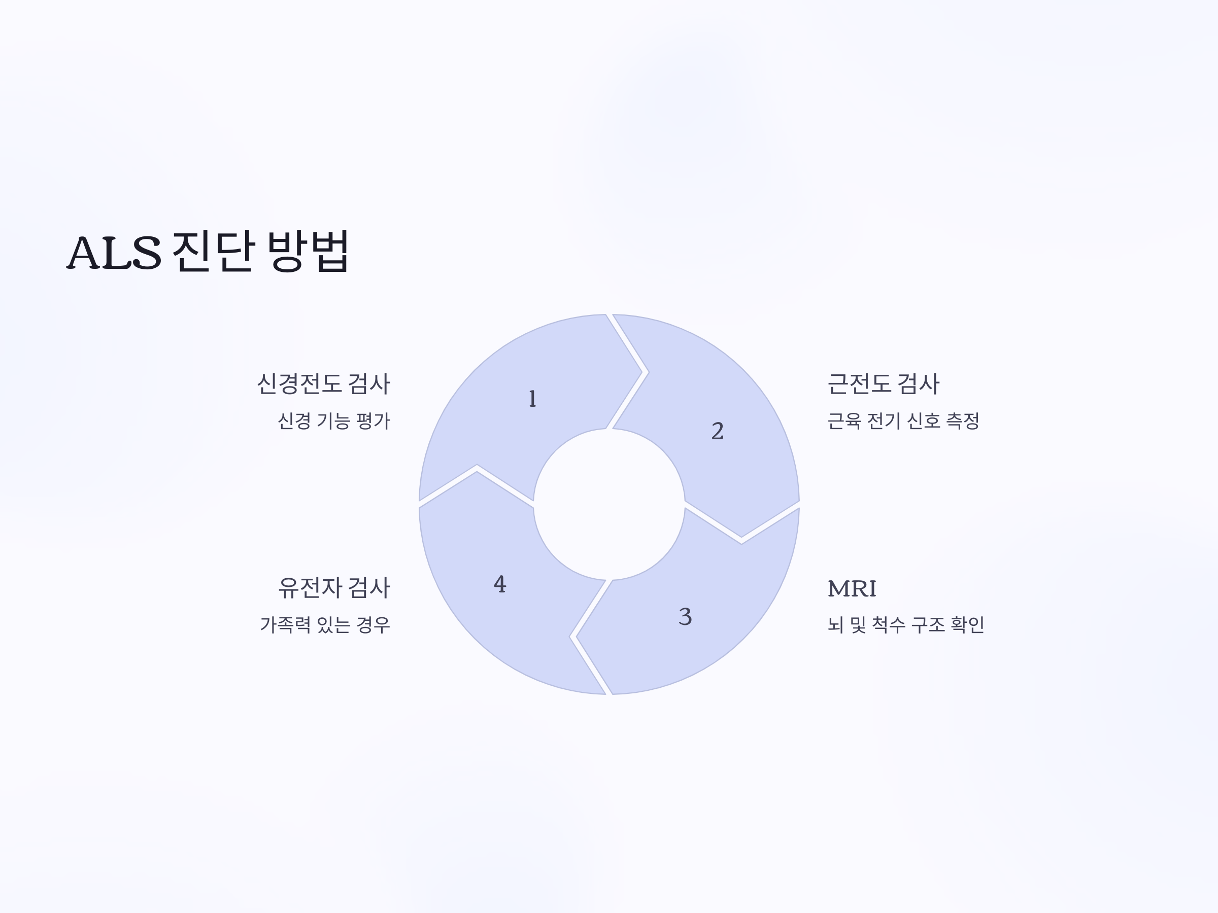 ALS는 혈액 검사나 영상 검사만으로 확진할 수 없으며, 여러 검사를 종합하여 진단이 내려집니다. 대표적인 진단 방법은 다음과 같습니다.