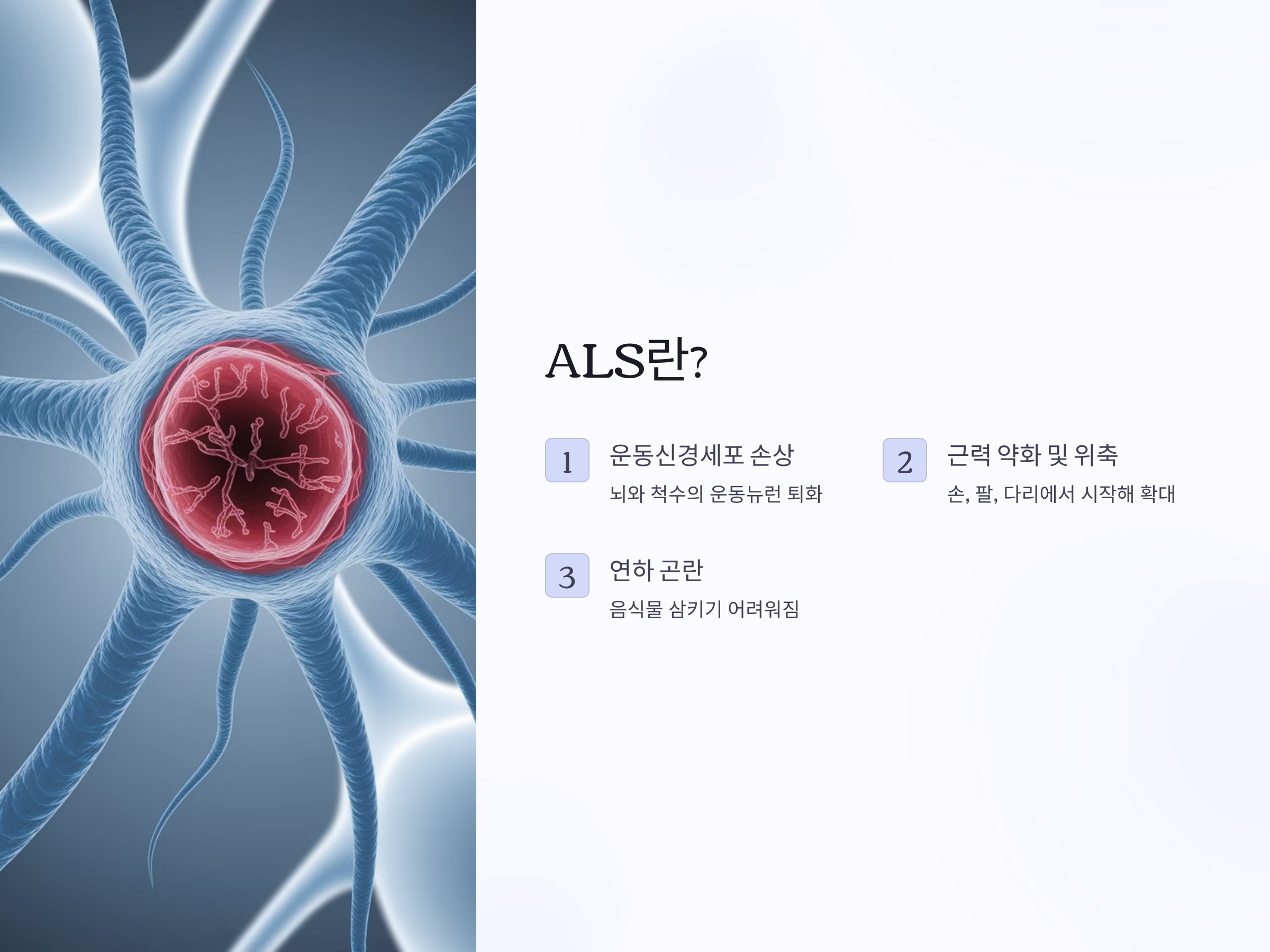 - 운동신경세포 손상: 뇌와 척수의 운동뉴런이 점진적으로 퇴화
