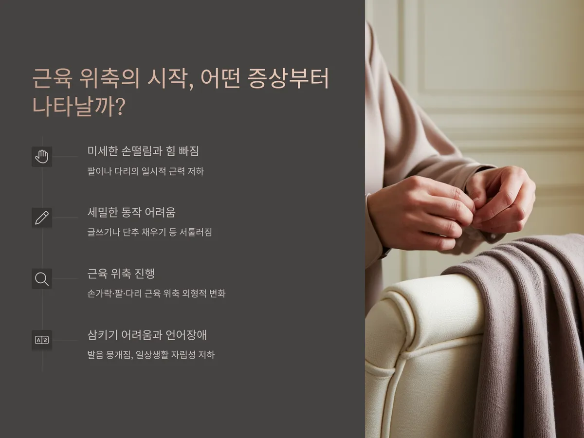 이 증상들은 일반적인 근육통이나 신경피로로 오해되기 쉬워 조기 진단이 어렵습니다. 특히 한쪽 팔 또는 다리부터 시작되어 점점 다른 부위로 퍼지는 양상을 보이는 것이 특징이며, 이러한 진행성 증상은 일상생활의 자립성을 빠르게 떨어뜨립니다.