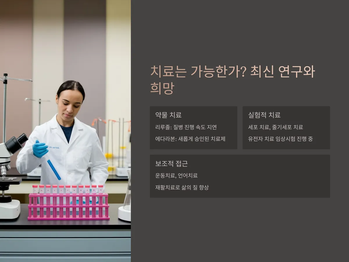 현재 루게릭병은 완치가 어려운 질환으로 알려져 있지만, 증상을 완화하고 삶의 질을 향상시키기 위한 다양한 치료가 이루어지고 있습니다. 대표적으로 리루졸(Riluzole)이라는 약물이 질병 진행 속도를 늦춰주는 효과가 있어 전 세계적으로 사용되고 있으며, 최근에는 에다라본(Edaravone)과 같은 새로운 약물도 승인되어 치료 옵션이 넓어지고 있습니다.