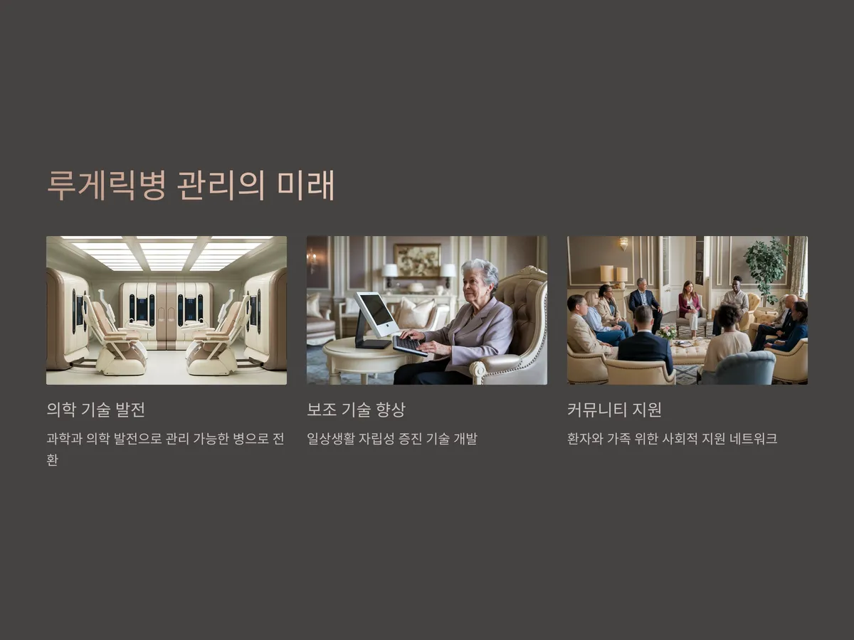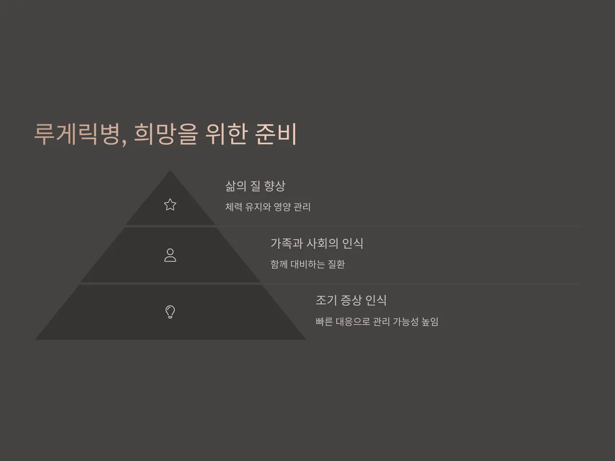 루게릭병은 단지 환자 개인의 문제가 아닙니다. 가족과 사회가 함께 인식하고 대비해야 하는 질환입니다. 따라서 조기 증상에 대한 인식 제고, 진단 체계의 발전, 치료 기술의 연구는 모두 중요한 과제입니다. 환자 개인도 체력 유지와 영양 관리, 심리적 안정 등을 통해 자신의 삶의 질을 최대한 유지할 수 있도록 노력해야 합니다.