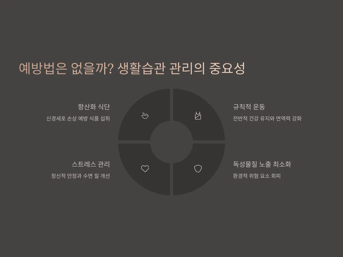 또한, 가족력이 있는 경우에는 정기적인 신경과 방문과 유전자 상담을 받는 것이 조기 발견에 큰 도움이 됩니다. 특히 유전적 원인을 지닌 경우, 예방 중심의 생활방식이 필수적입니다. 초기 증상을 느끼는 즉시 병원을 방문하여 조기에 대처하는 것이 가장 확실한 예방법입니다.