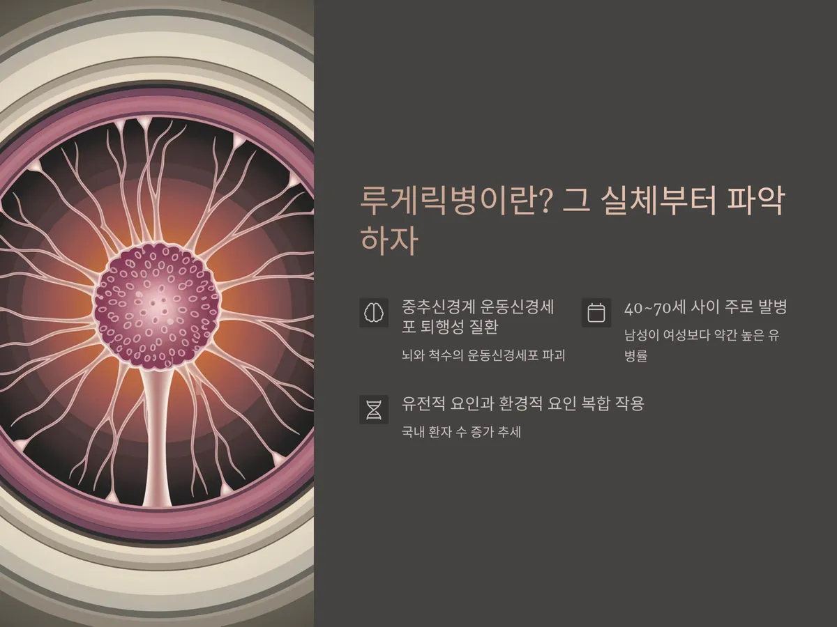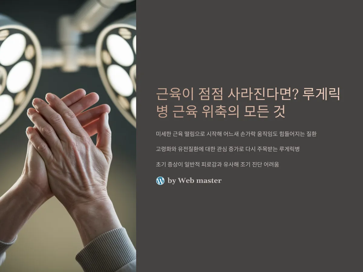 미세한 근육 떨림으로 시작해, 어느새 손가락을 움직이는 것도 힘들어진다면? 최근 고령화와 유전질환에 대한 관심이 커지면서 루게릭병(ALS, 근위축성 측삭경화증)이 다시 주목받고 있습니다. 특히 초기 증상이 일반적인 피로감이나 통증과 유사해 조기 진단이 어렵고, 치료법이 뚜렷하지 않아 더 많은 주의가 필요합니다. 이번 글에서는 루게릭병의 근육 위축 증상과 진단, 예방법 및 최신 치료법까지 상세히 다루어, 혹시 모를 이상 증상에 대한 경각심을 높이고 조기 대응의 중요성을 강조합니다. 특히 가족력이 있는 경우나, 40세 이상에서 원인 불명의 근육 감소를 경험한다면 꼭 확인해봐야 할 정보입니다.