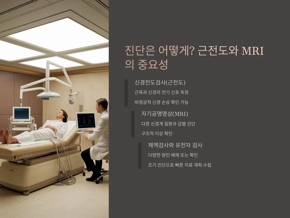 루게릭병 진단은 단순 혈액검사나 엑스레이로는 확인이 불가능하며, 신경전도검사(근전도), 자기공명영상(MRI), 요추천자 등의 정밀검사를 통해 진행됩니다. 근전도는 근육과 신경의 전기 신호를 측정하여 비정상적인 신경 손상을 확인할 수 있는 가장 핵심적인 검사 중 하나입니다.
