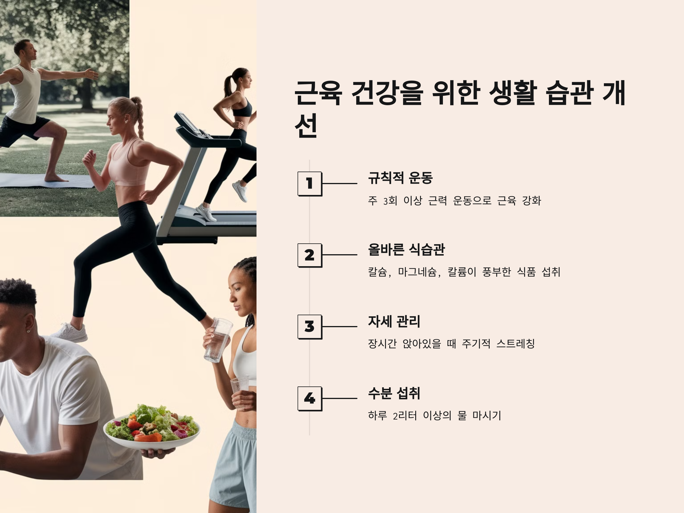근육 건강을 유지하기 위해서는 생활 습관을 개선하는 것이 가장 중요합니다. 규칙적인 운동과 올바른 식습관은 근육을 강화하는 데 필수적인 요소입니다. 또한, 평소 앉아 있는 시간이 길다면, 자주 일어나서 스트레칭을 해주는 것이 좋습니다. 간단한 스트레칭만으로도 근육의 이완을 도와줄 수 있습니다.