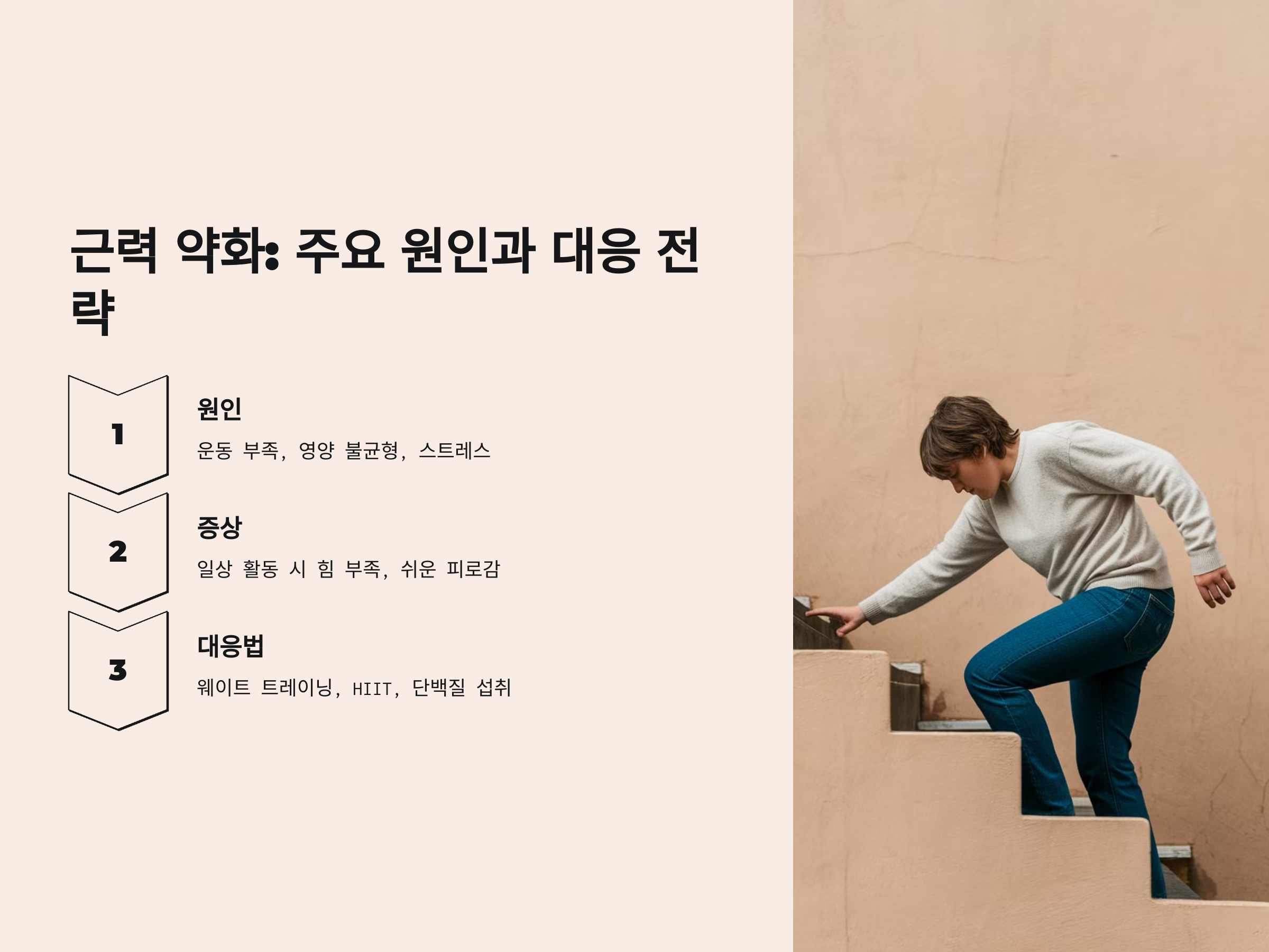 근력 약화는 나이가 들어감에 따라 자연스럽게 발생할 수 있지만, 운동 부족이나 영양 불균형으로도 발생할 수 있습니다. 특히 단백질과 같은 필수 영양소가 부족한 식습관은 근육의 성장과 회복을 방해하며, 결과적으로 근력이 저하될 수 있습니다. 또한, 과도한 스트레스나 수면 부족도 근력 약화의 원인 중 하나로 작용할 수 있습니다.