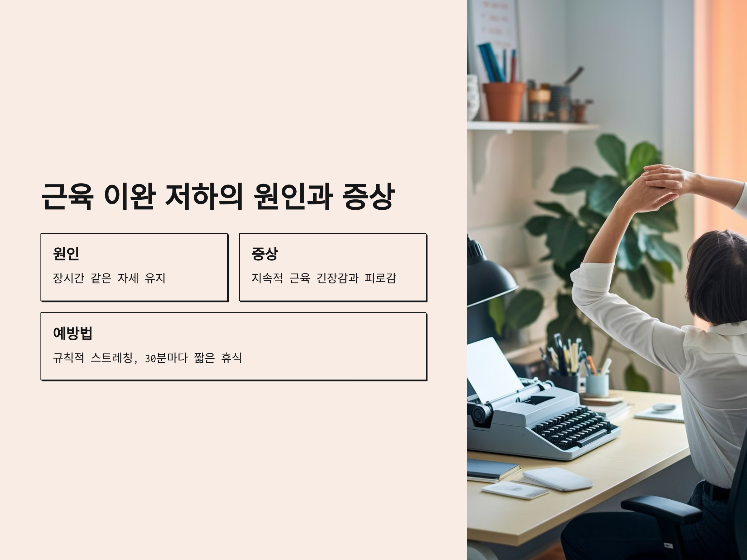 근육 이완 저하는 근육이 수축된 상태에서 자연스럽게 풀리는 능력이 감소하는 상태를 의미합니다. 이완 능력이 저하되면 근육이 긴장 상태로 유지되며, 이는 불편함과 통증을 유발할 수 있습니다. 이러한 상태는 주로 장시간 앉아 있거나 특정 자세를 유지하는 생활 습관에서 발생할 수 있습니다. 예를 들어, 하루 종일 컴퓨터 앞에 앉아 있는 사무직 종사자들이나, 신체 활동이 적은 사람들에서 근육 이완 저하가 흔히 나타납니다.