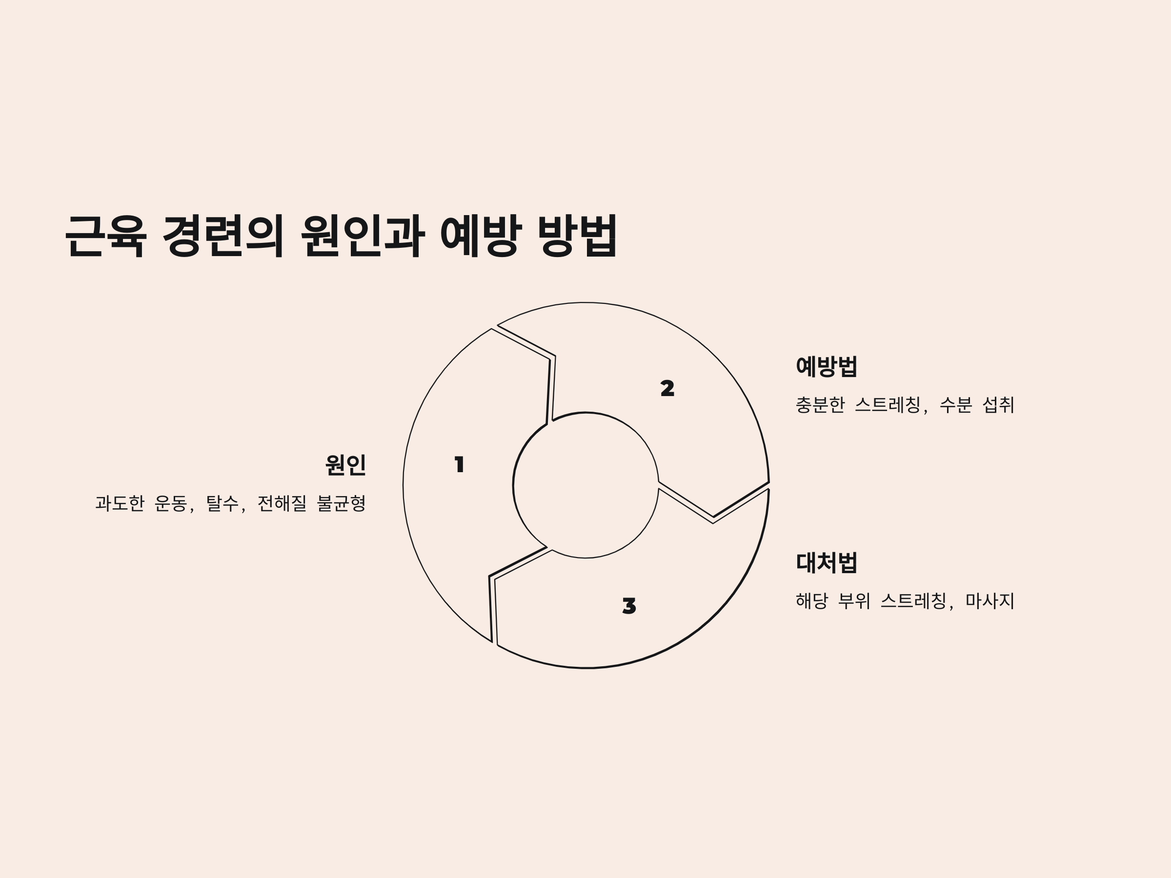 근육 경련은 근육이 갑작스럽게 수축하고 풀리지 않으면서 발생하는 통증입니다. 근육 경련은 주로 과도한 운동, 탈수, 전해질 불균형, 혹은 잘못된 자세로 인해 발생할 수 있습니다. 특히 여름철에는 땀으로 인해 체내 전해질이 부족해지면 경련이 자주 발생할 수 있습니다. 또한, 운동 전후 스트레칭을 충분히 하지 않거나, 너무 강도 높은 운동을 할 경우에도 근육 경련이 발생할 수 있습니다.