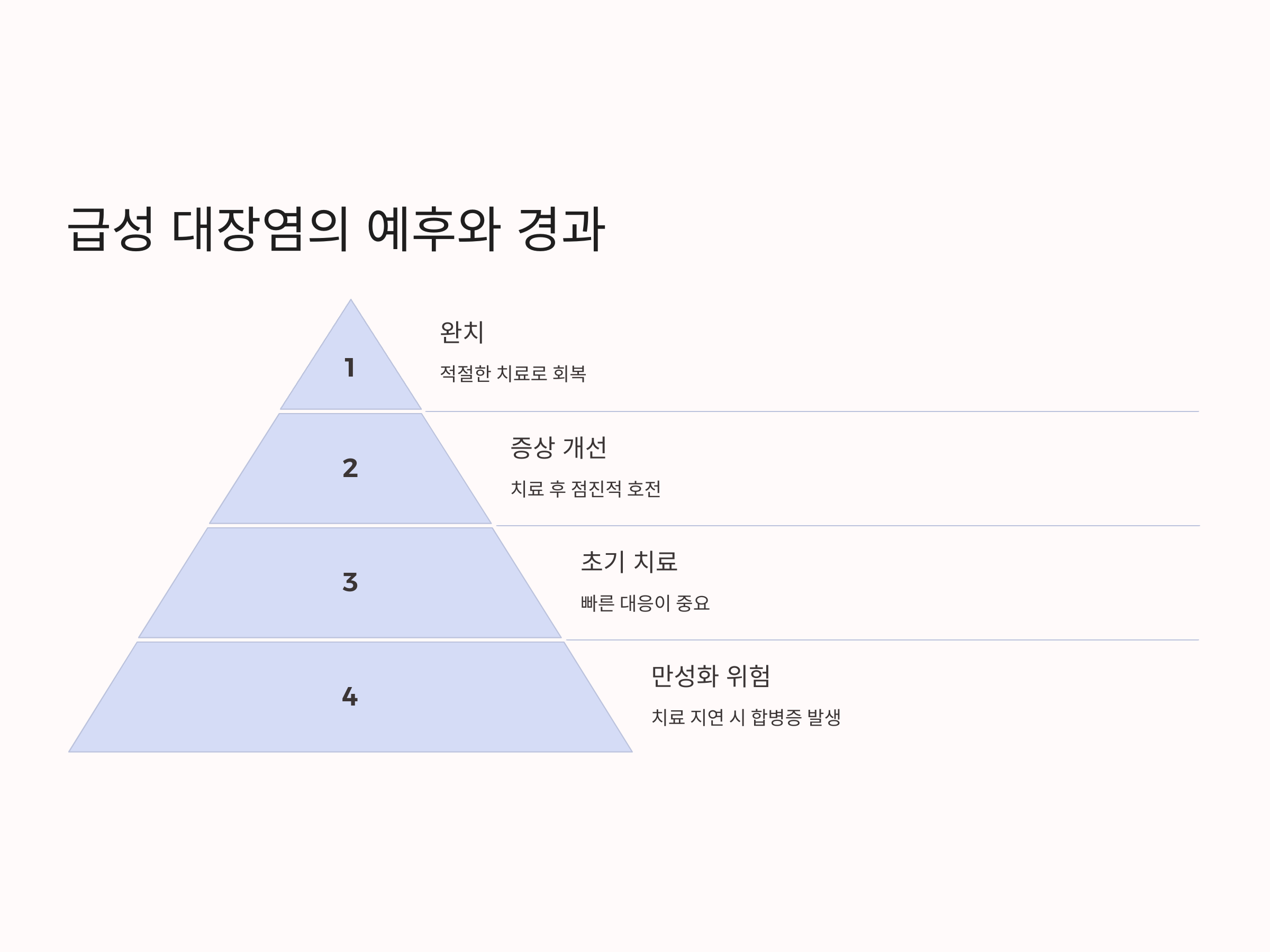 급성 대장염의 예후는 치료의 적절성에 따라 다릅니다. 대부분의 경우, 적절한 치료를 받으면 증상은 개선되며 완치될 수 있습니다. 그러나 치료가 지연되거나 적절히 이루어지지 않으면, 대장에 지속적인 손상이 가해져 만성 대장염으로 발전할 수 있습니다. 만성 대장염은 더 많은 합병증을 동반할 수 있기 때문에, 초기 치료가 매우 중요합니다.