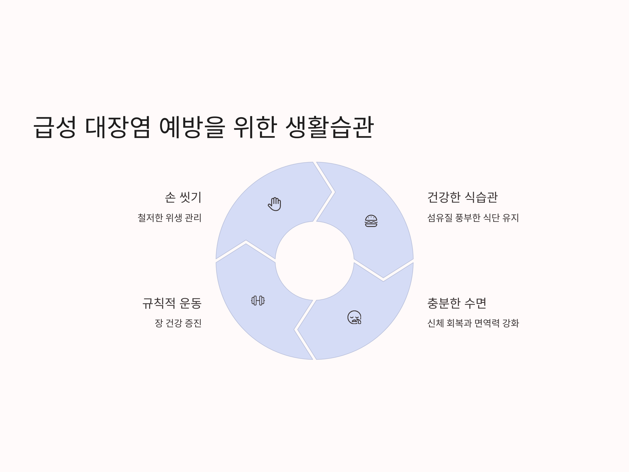또한, 급성 대장염 환자는 충분한 휴식과 수분 섭취가 필요합니다. 설사와 구토로 인한 탈수를 방지하기 위해 수분 보충을 충분히 해야 하며, 가벼운 음식을 섭취하는 것이 좋습니다. 자극적인 음식이나 알콜은 피하고, 식이섬유가 많은 음식을 섭취하는 것이 회복에 도움이 됩니다.