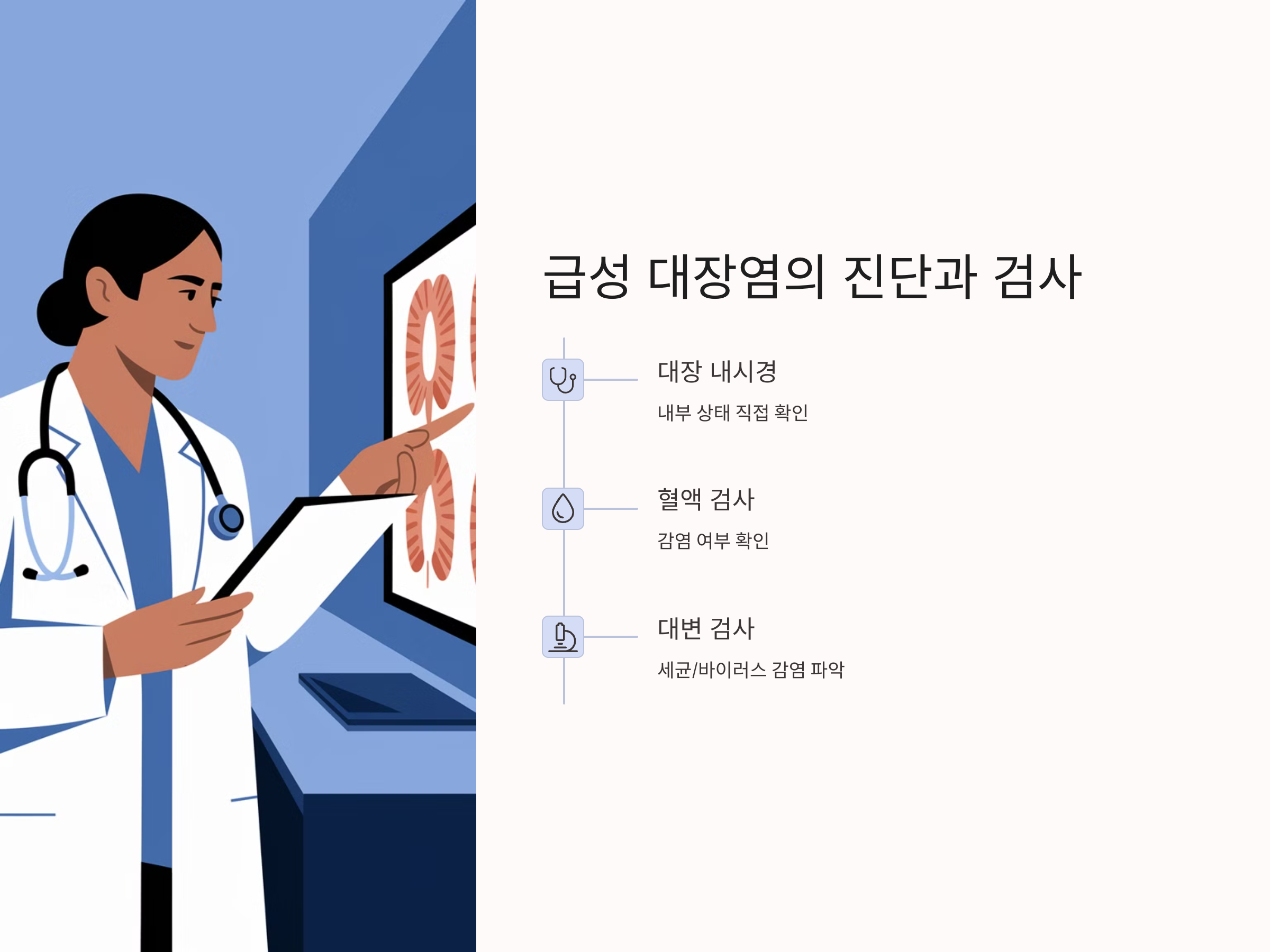 급성 대장염을 정확하게 진단하기 위해서는 병원의 진단과 검사가 필요합니다. 가장 흔히 사용되는 검사 방법은 대장 내시경 검사입니다. 내시경을 통해 대장의 내부 상태를 직접 확인할 수 있으며, 염증의 정도나 출혈의 원인 등을 파악할 수 있습니다. 또한, 혈액 검사와 대변 검사를 통해 감염 여부를 확인하고, 세균이나 바이러스 감염이 원인인지를 파악할 수 있습니다.