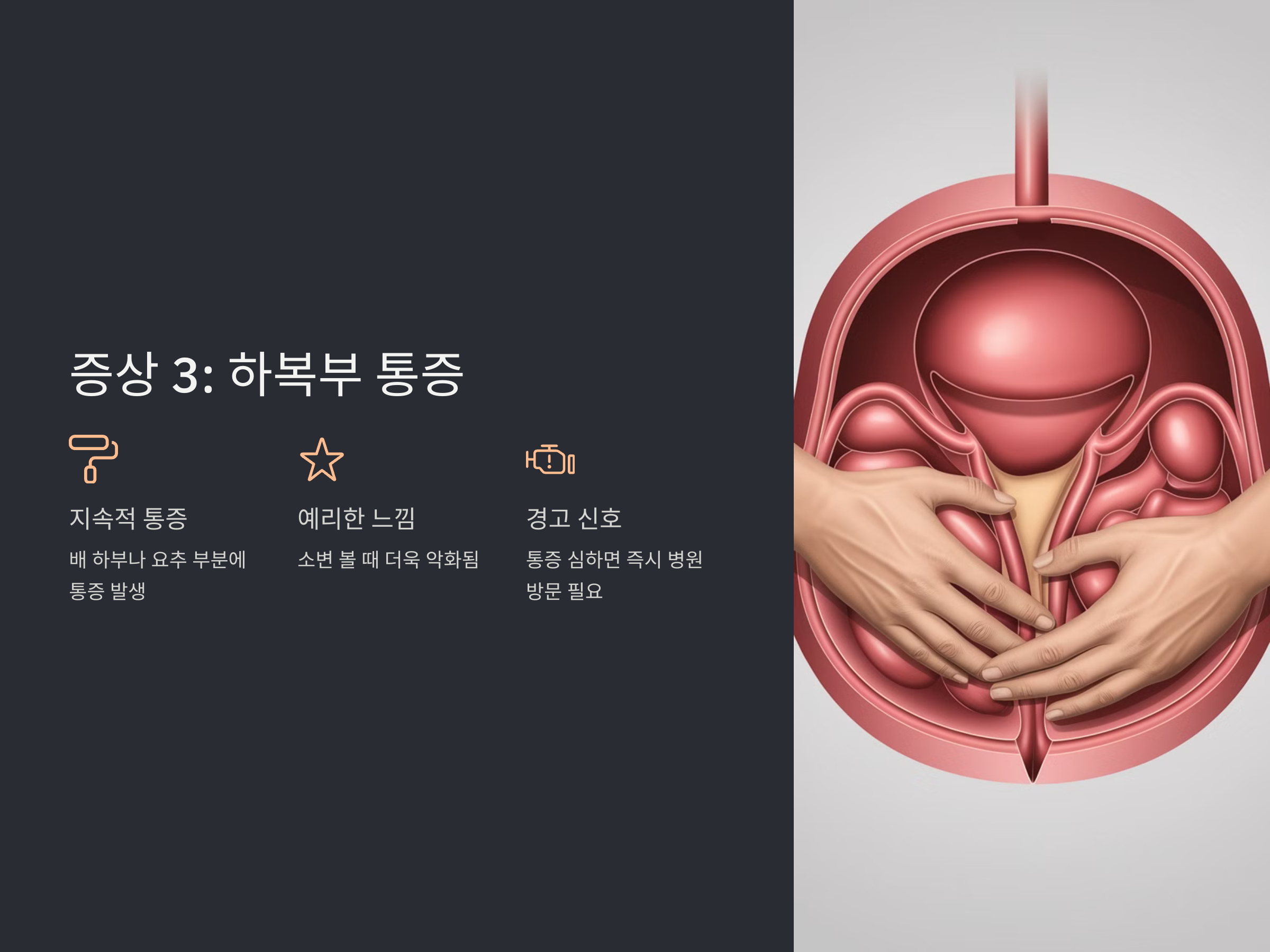 통증이 심해지면 방광염이 이미 악화되었을 가능성이 있으므로, 즉시 병원에 방문해 적절한 진료를 받는 것이 중요합니다. 이 통증은 간단한 약물 치료로 완화될 수 있으므로 조기 치료가 중요합니다.