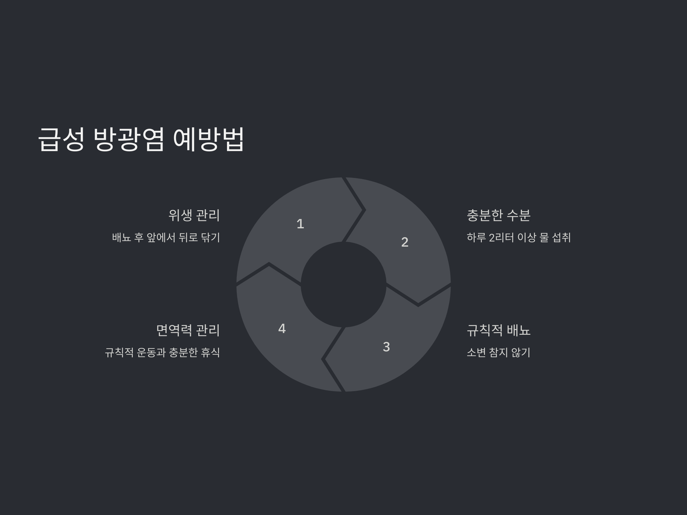 급성 방광염을 예방하는 가장 중요한 방법은 위생 관리입니다. 특히 여성은 배뇨 후 항상 앞에서 뒤로 닦아야 하며, 자주 화장실에 가는 습관을 들이는 것이 중요합니다. 또한, 충분한 수분을 섭취하여 소변을 자주 배출하도록 해야 합니다. 방광에 세균이 쌓이지 않도록 하는 것이 급성 방광염을 예방하는 데 도움이 됩니다.