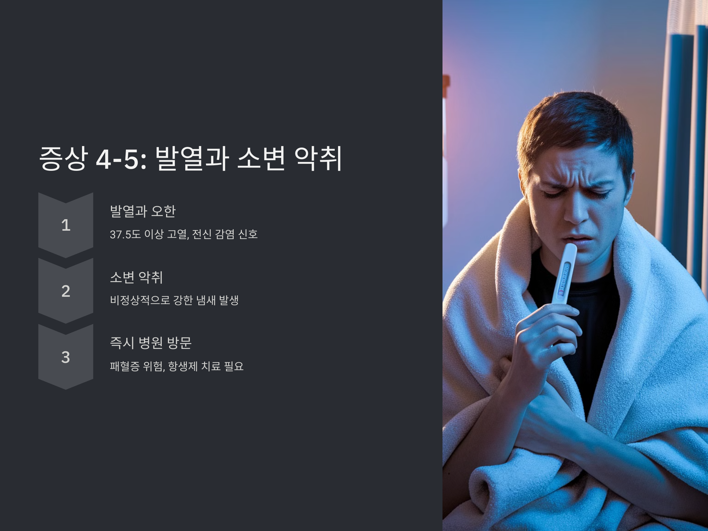 발열과 오한이 함께 나타나면 즉시 병원을 방문해야 하며, 이 증상은 방광염을 치료하는 데 있어 매우 중요한 경고 신호입니다. 적절한 항생제 치료가 필요하며, 이를 놓치면 더 큰 위험을 초래할 수 있습니다.