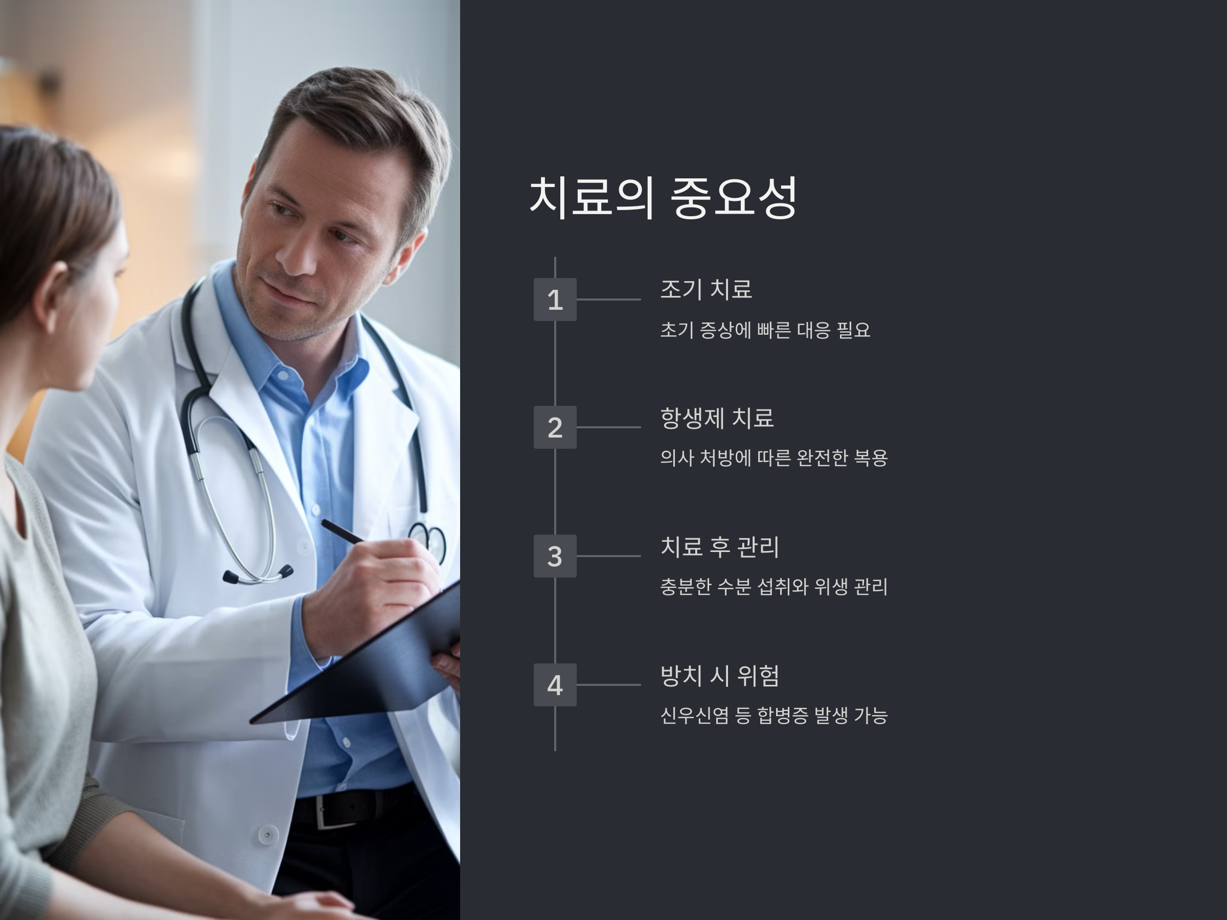 급성 방광염은 초기 증상만으로도 충분히 치료가 가능합니다. 하지만 방치하면 감염이 심각한 상태로 진행될 수 있기 때문에, 빠른 치료가 매우 중요합니다. 급성 방광염을 치료하지 않으면 방광에 지속적인 염증이 발생하고, 이는 요로 감염이 신장까지 퍼질 위험이 있습니다. 이런 상황을 방지하려면 증상이 나타난 즉시 병원에 방문하여 항생제를 처방받는 것이 최선의 방법입니다.