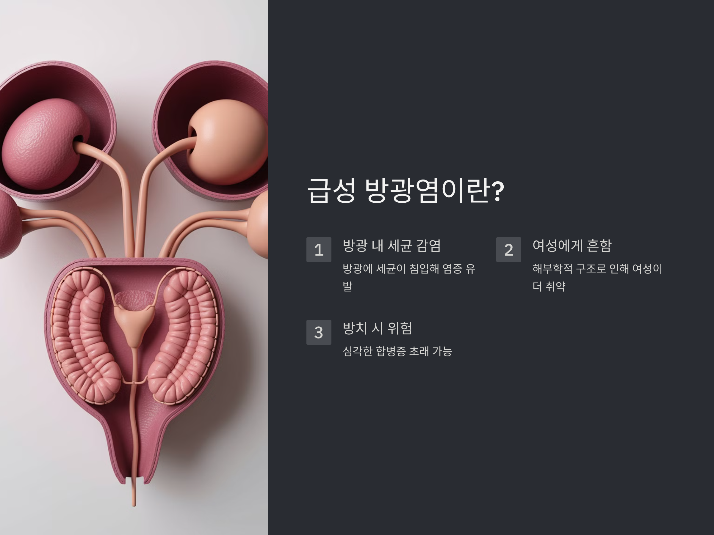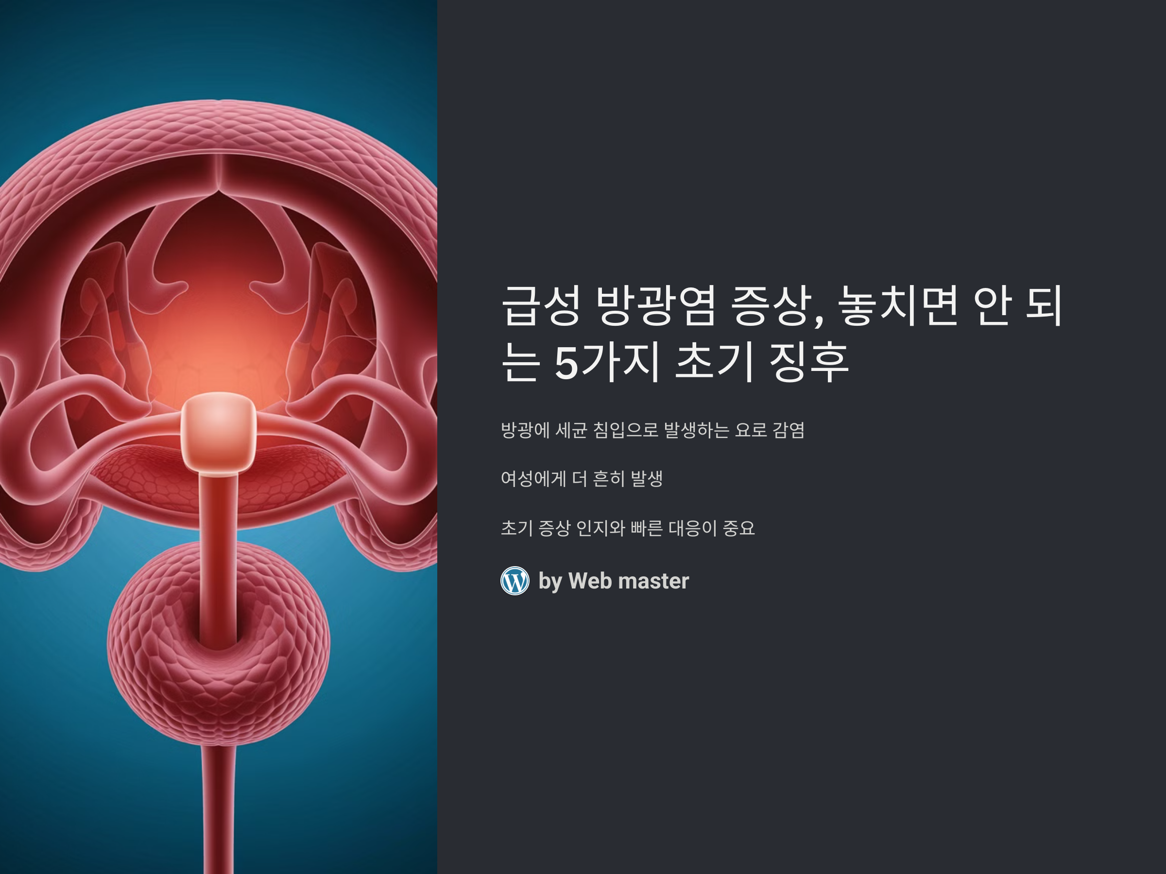 급성 방광염은 흔히 발생하는 요로 감염 중 하나로, 특히 여성들 사이에서 자주 나타납니다. 이 질환은 방광에 세균이 침입하여 염증을 일으키는 상태로, 방치하면 심각한 합병증을 초래할 수 있습니다. 하지만 많은 사람들이 방광염의 초기 증상을 가볍게 여겨 치료를 미루곤 합니다. 그래서 이번 포스트에서는 급성 방광염의 주요 증상들을 살펴보고, 이를 빠르게 인지하여 적절히 대응하는 방법을 안내드리겠습니다.