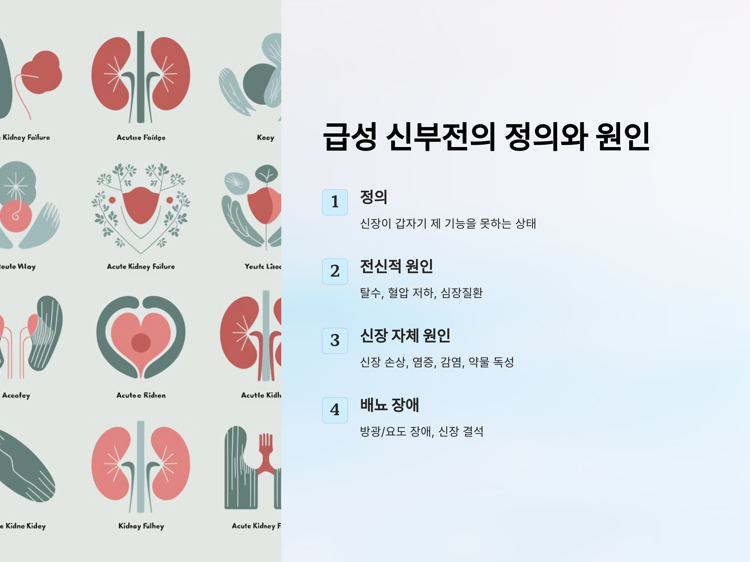 - 전신적 원인: 심한 탈수, 혈압 저하, 심장질환, 대사 이상 등이 신장으로 가는 혈류를 줄여 급성 신부전을 유발할 수 있습니다.
