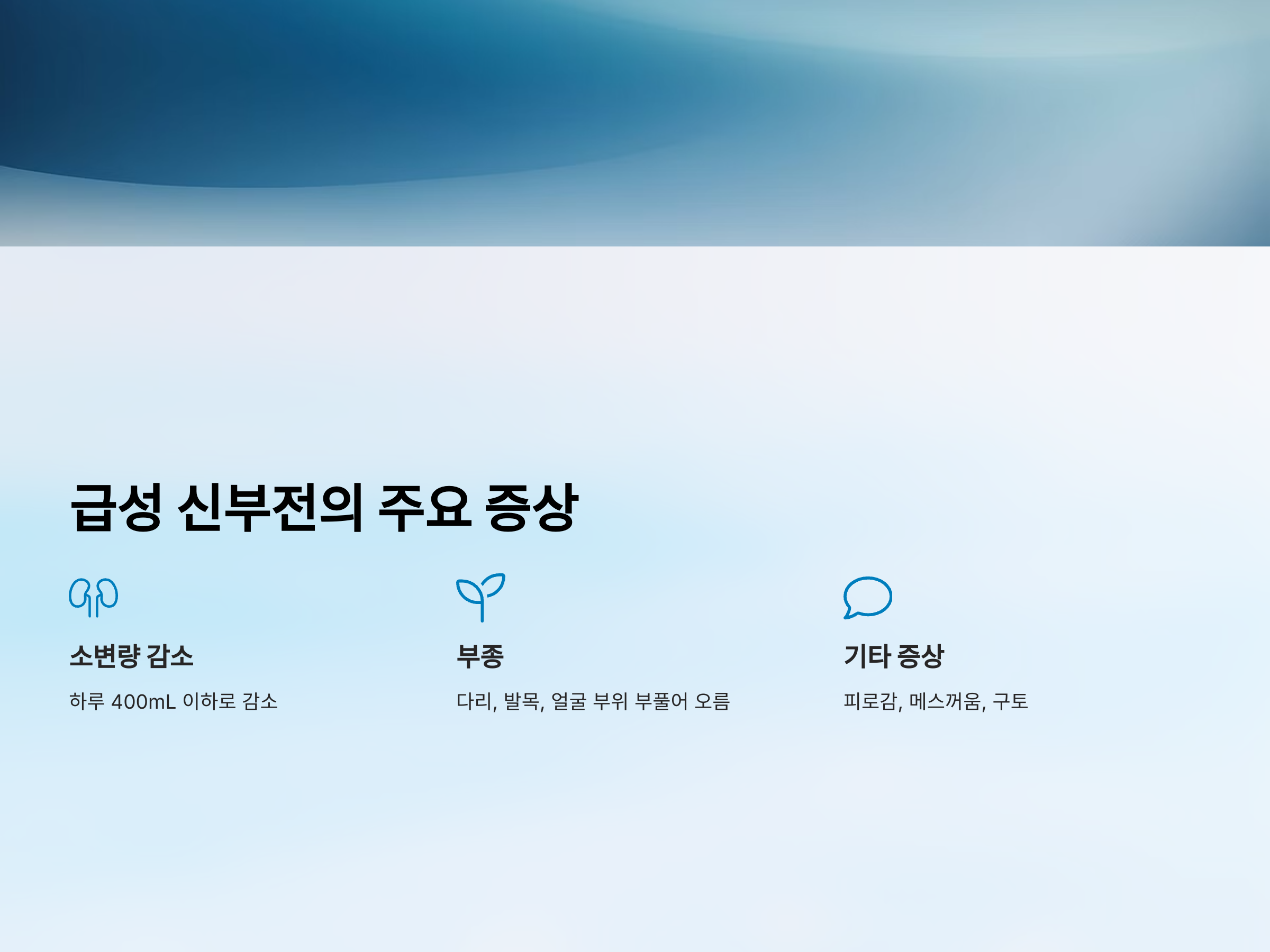 급성 신부전은 적절한 치료와 관리가 이루어지지 않으면 생명에 위협을 줄 수 있는 심각한 상태입니다. 소변량 감소와 부종은 급성 신부전의 대표적인 증상으로, 이를 빠르게 인식하고 적절한 치료를 받는 것이 중요합니다. 원인에 따라 다양한 치료가 필요하며, 신장 기능을 회복하기 위한 꾸준한 관리와 예방이 필수적입니다. 특히, 건강한 식습관과 생활습관을 유지하는 것이 급성 신부전 예방에 큰 도움이 됩니다.