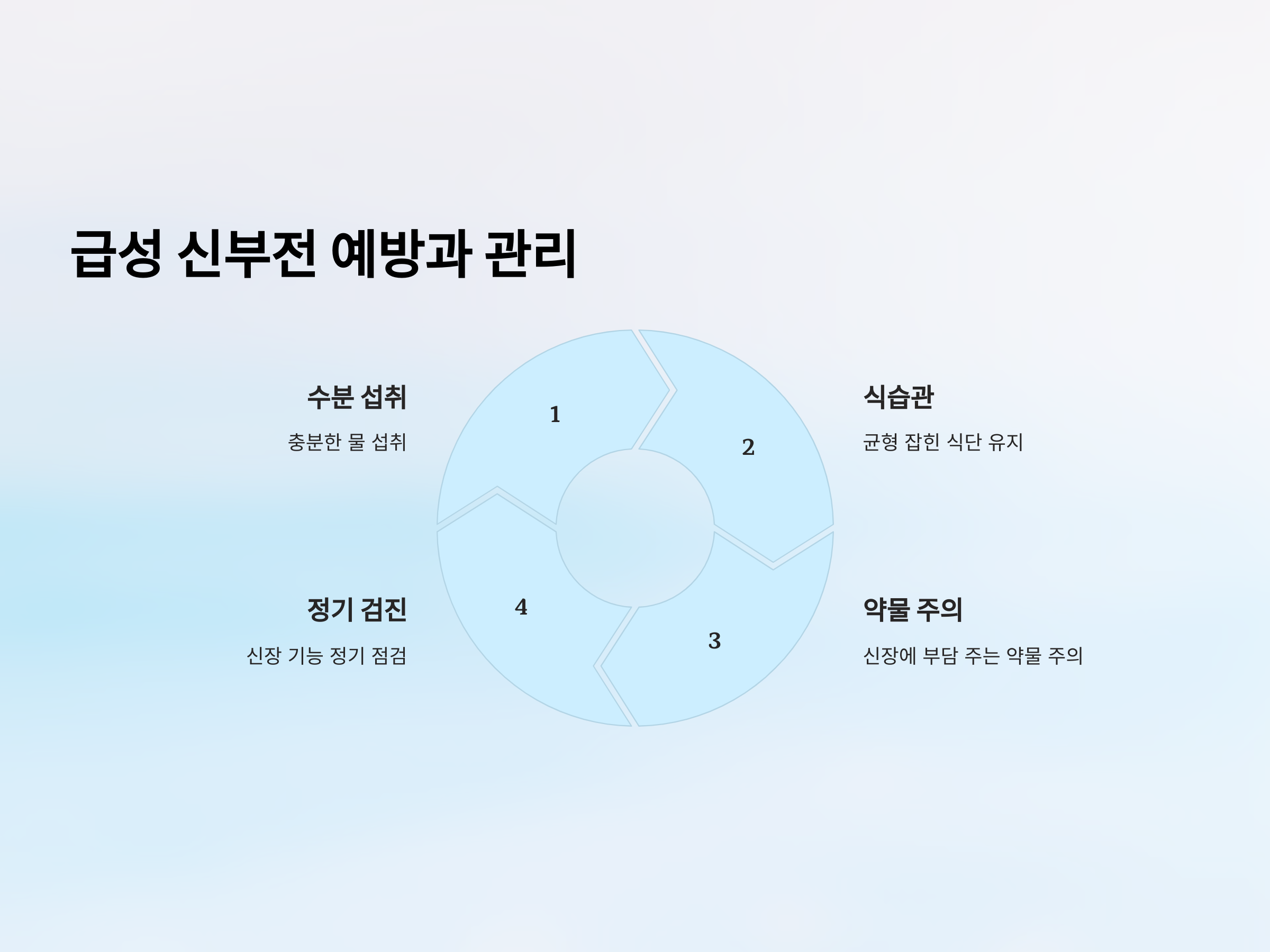 급성 신부전을 예방하기 위해서는 적절한 수분 섭취와 건강한 식습관을 유지하고, 약물 사용 시 신장에 미치는 영향을 고려해야 합니다. 또한, 정기적인 건강검진을 통해 신장 기능을 점검하는 것이 중요합니다.