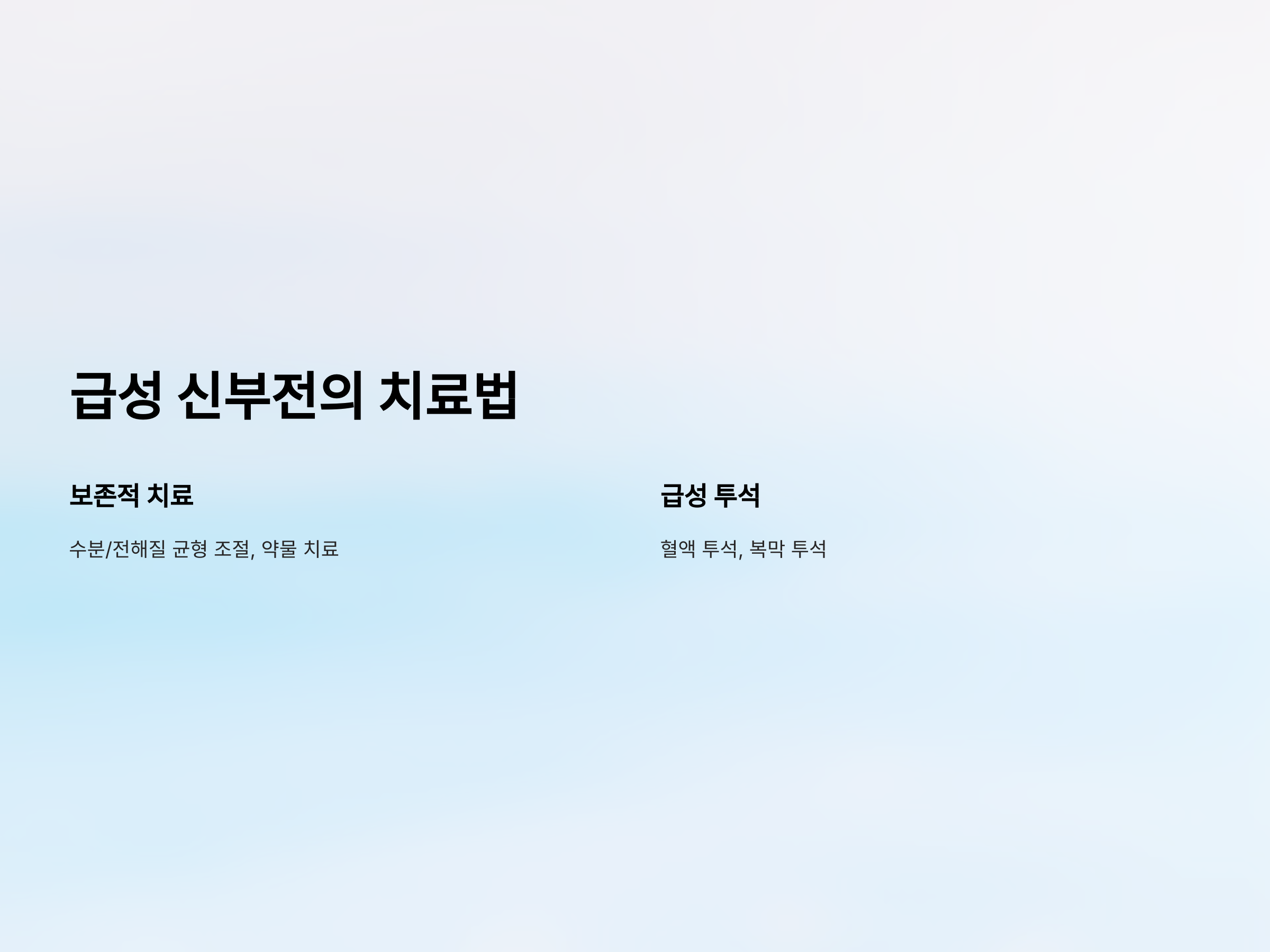 급성 신부전의 치료는 원인에 따라 달라지며, 치료의 핵심은 신장의 기능을 회복시키고 합병증을 예방하는 것입니다. 치료 방법은 크게 두 가지로 나눌 수 있습니다: