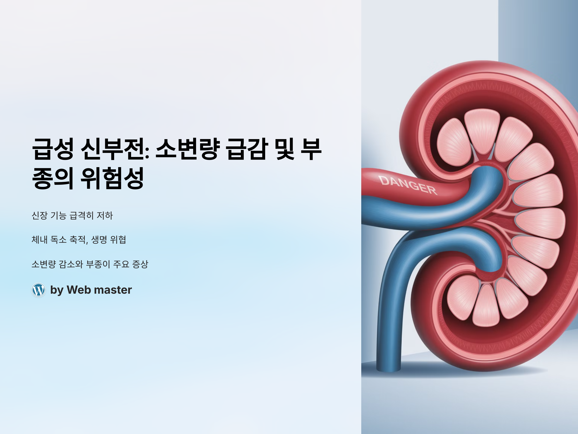 급성 신부전은 신장의 기능이 갑자기 저하되는 상태로, 소변량이 급감하거나 부종이 발생하는 등의 증상이 나타날 수 있습니다. 이 상태는 신장의 필터링 기능에 장애가 발생해 체내 독소가 축적되며, 생명에 위협을 줄 수 있습니다. 특히 소변량 감소와 부종은 급성 신부전의 주요 증상으로 나타나며, 이를 빠르게 인식하고 치료하는 것이 매우 중요합니다.