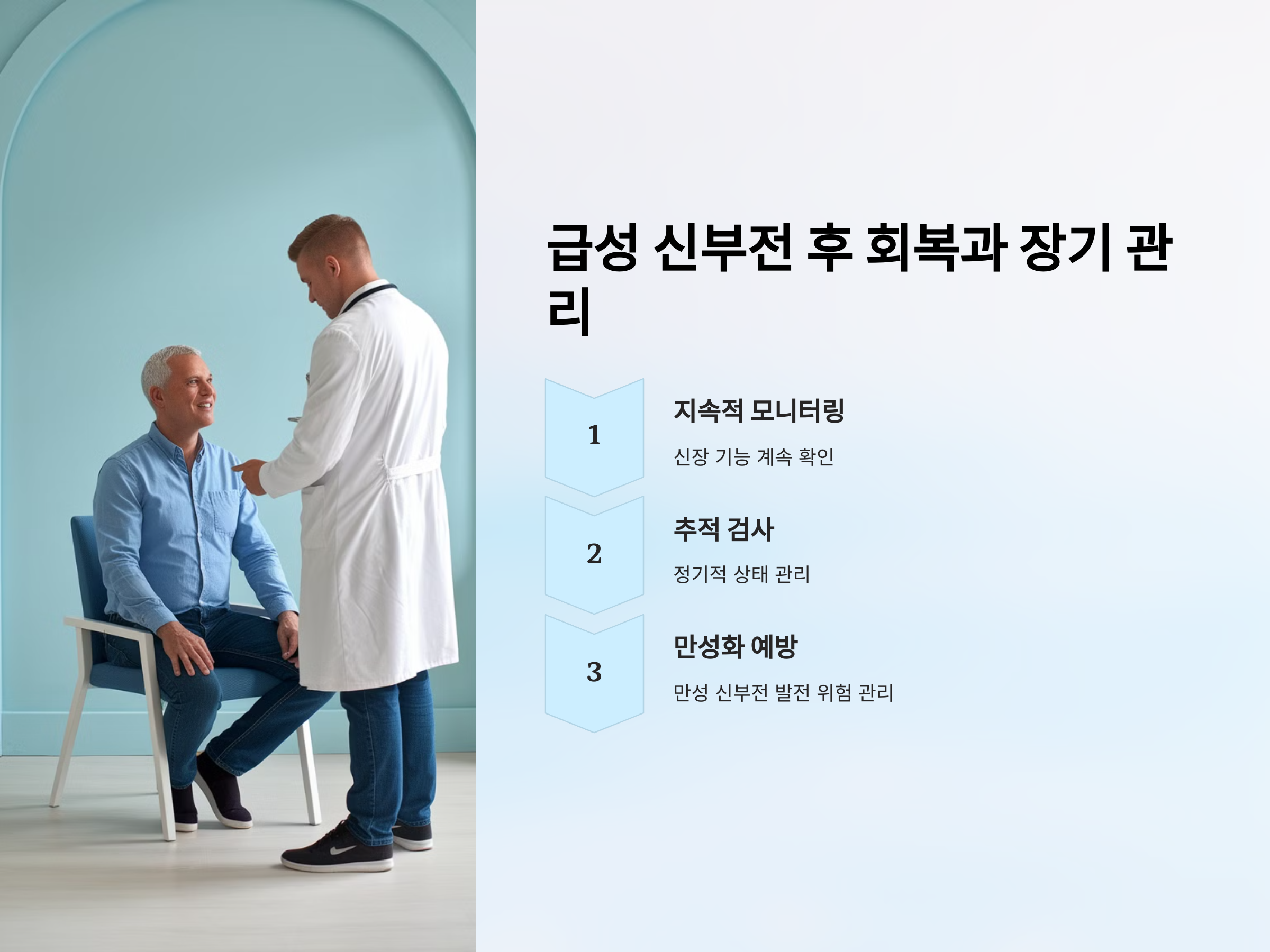 급성 신부전은 빠르게 회복될 수 있지만, 회복 후에도 장기적인 관리가 필요합니다. 치료가 끝난 후에도 신장 기능을 계속 모니터링하고, 신장이 완전히 회복되지 않은 경우에는 지속적인 치료가 필요할 수 있습니다. 특히 만성 신부전으로 발전할 위험이 있는 경우, 정기적인 추적 검사를 통해 상태를 관리해야 합니다.
