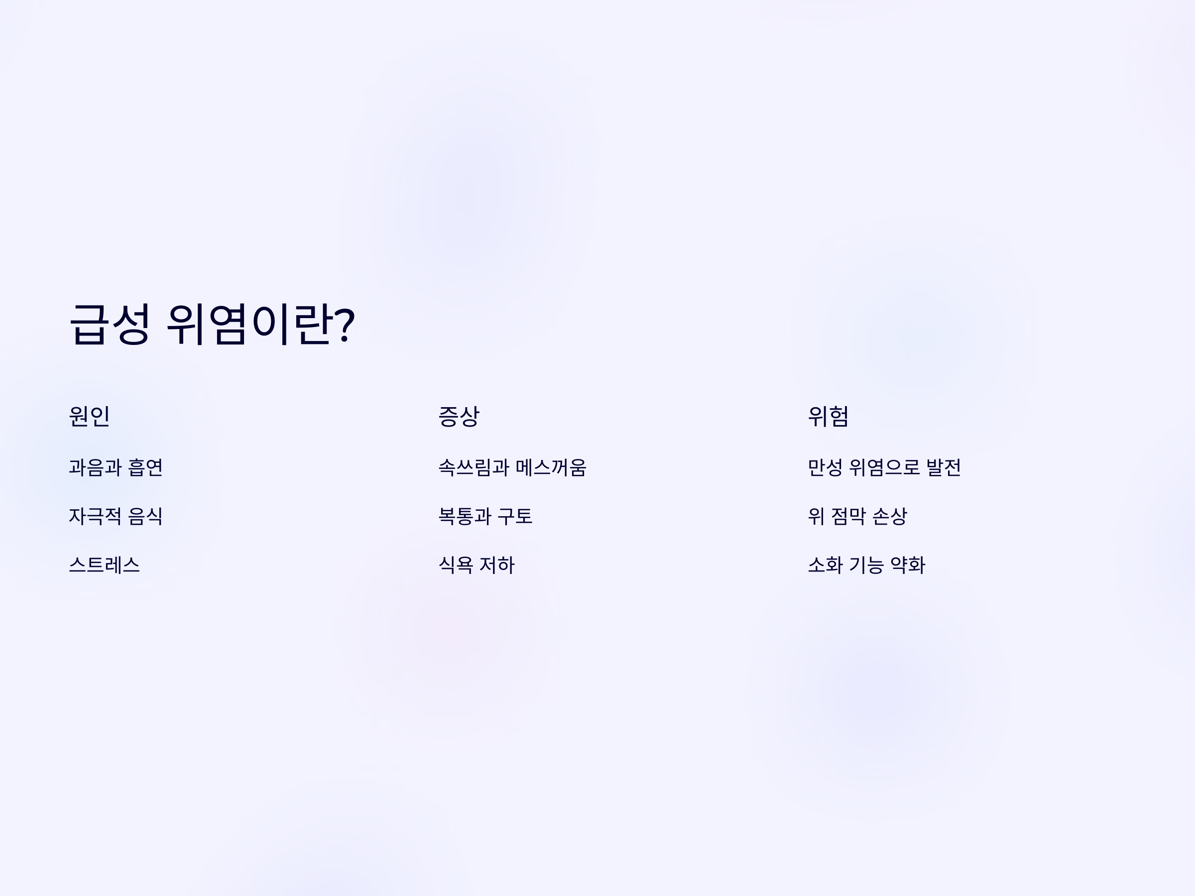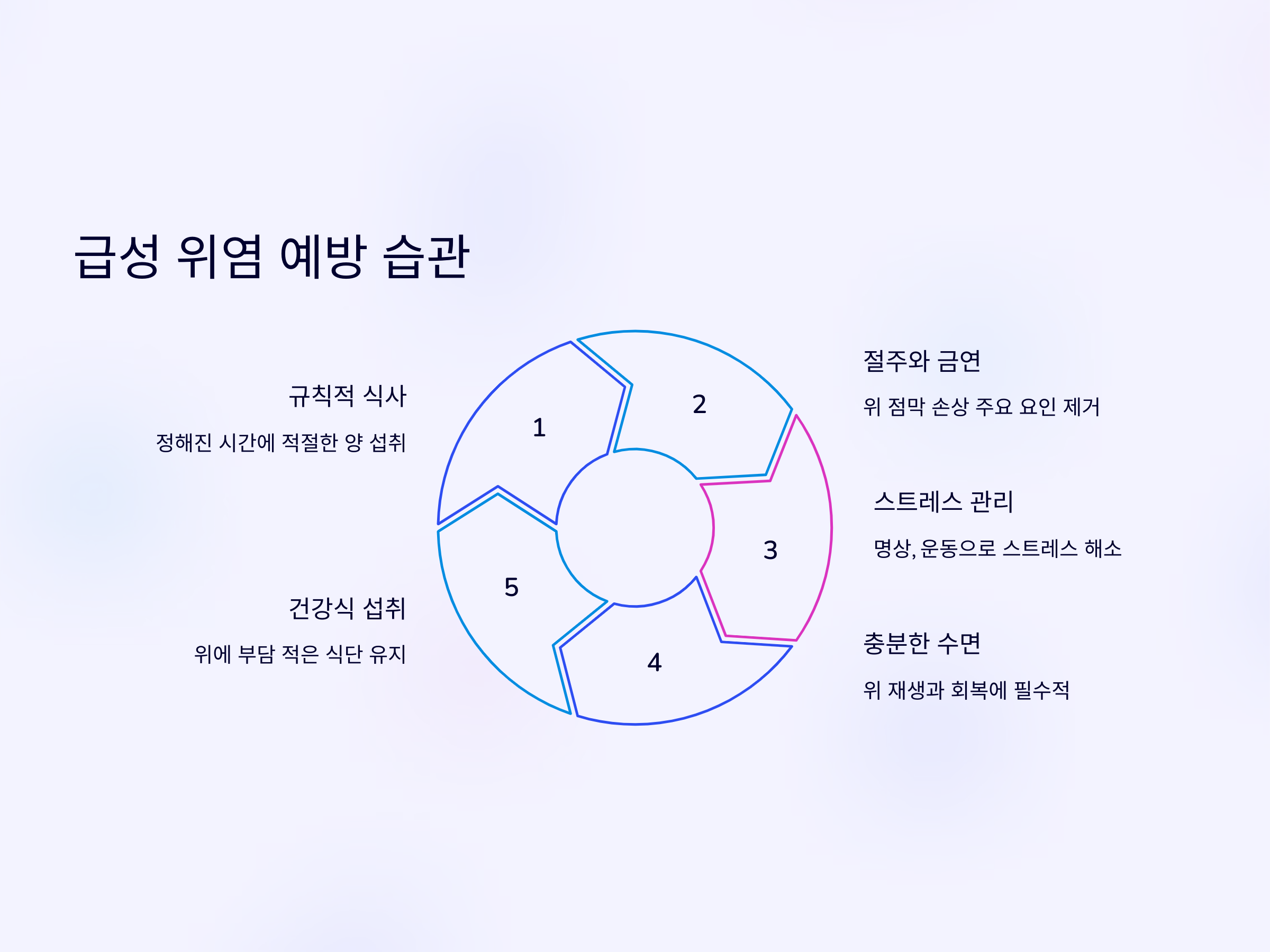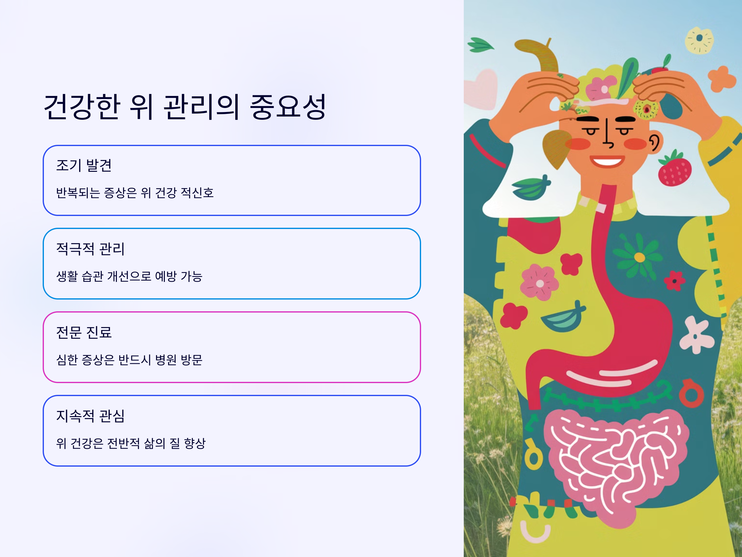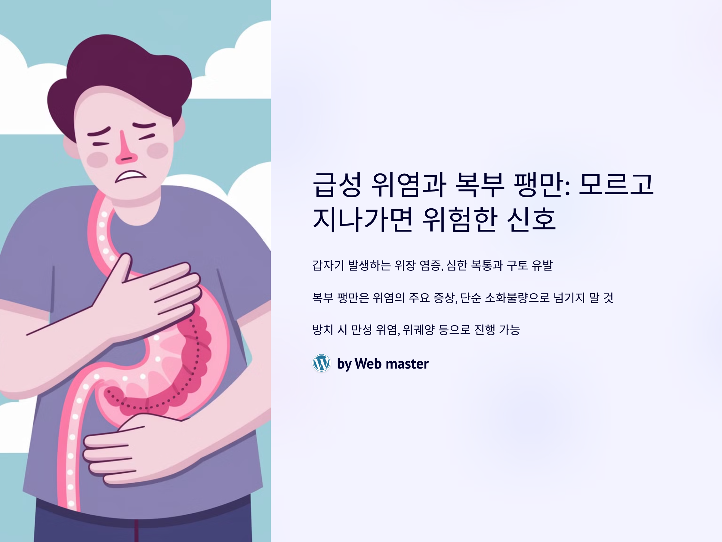 급성 위염과 복부 팽만은 단순한 소화불량이 아니라 위 건강의 적신호일 수 있습니다. 증상이 반복된다면 반드시 생활 습관을 개선하고 필요할 경우 병원에서 정확한 진단을 받아야 합니다. 위를 보호하는 올바른 식습관과 건강한 생활 습관을 실천하여 위염을 예방하고 건강한 소화 시스템을 유지하세요.