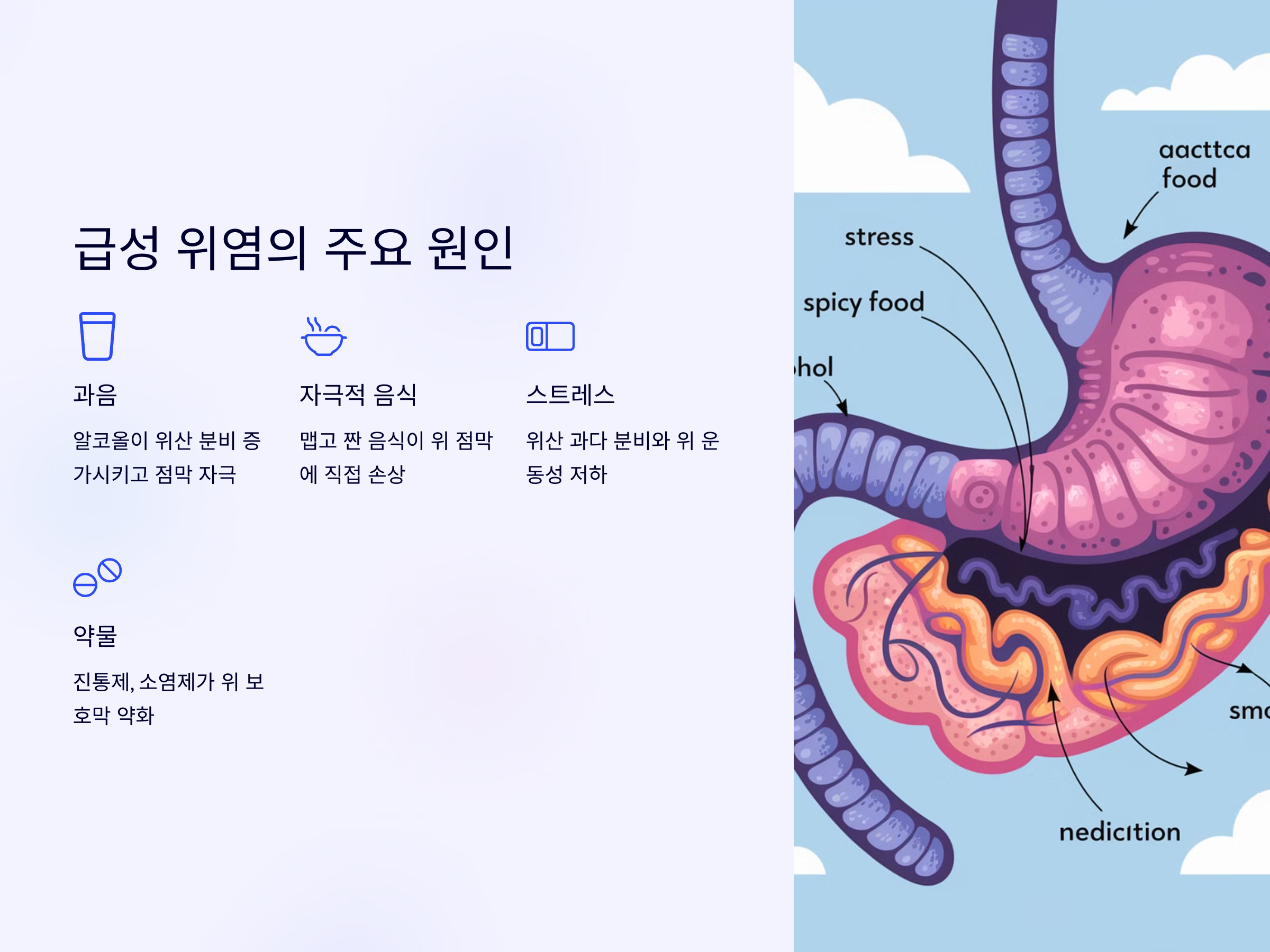 급성 위염은 위 점막이 손상되면서 발생하는 염증성 질환으로, 다양한 원인에 의해 유발될 수 있습니다. 가장 흔한 원인은 과도한 음주, 흡연, 불규칙한 식사, 맵고 자극적인 음식 섭취 등입니다. 또한 비스테로이드성 소염제(NSAIDs) 같은 특정 약물 복용도 위 점막을 손상시켜 급성 위염을 유발할 수 있습니다.