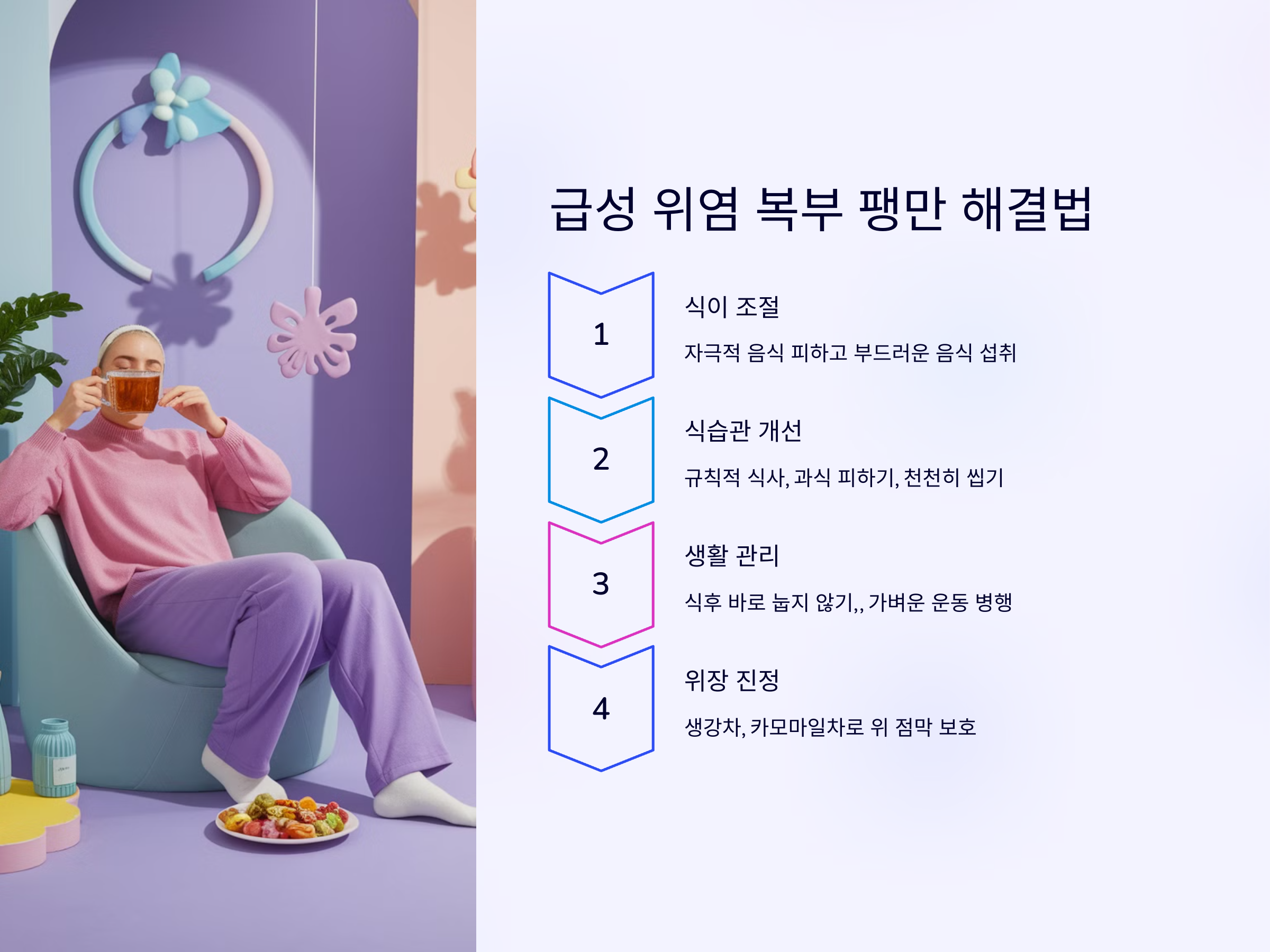 복부 팽만은 급성 위염과 함께 자주 발생하는 증상으로, 위산 과다 혹은 위장 기능 저하로 인해 위에 가스가 차면서 나타납니다. 위의 염증이 심해지면 소화 능력이 떨어지고 음식이 제대로 분해되지 않아 가스가 차게 됩니다.