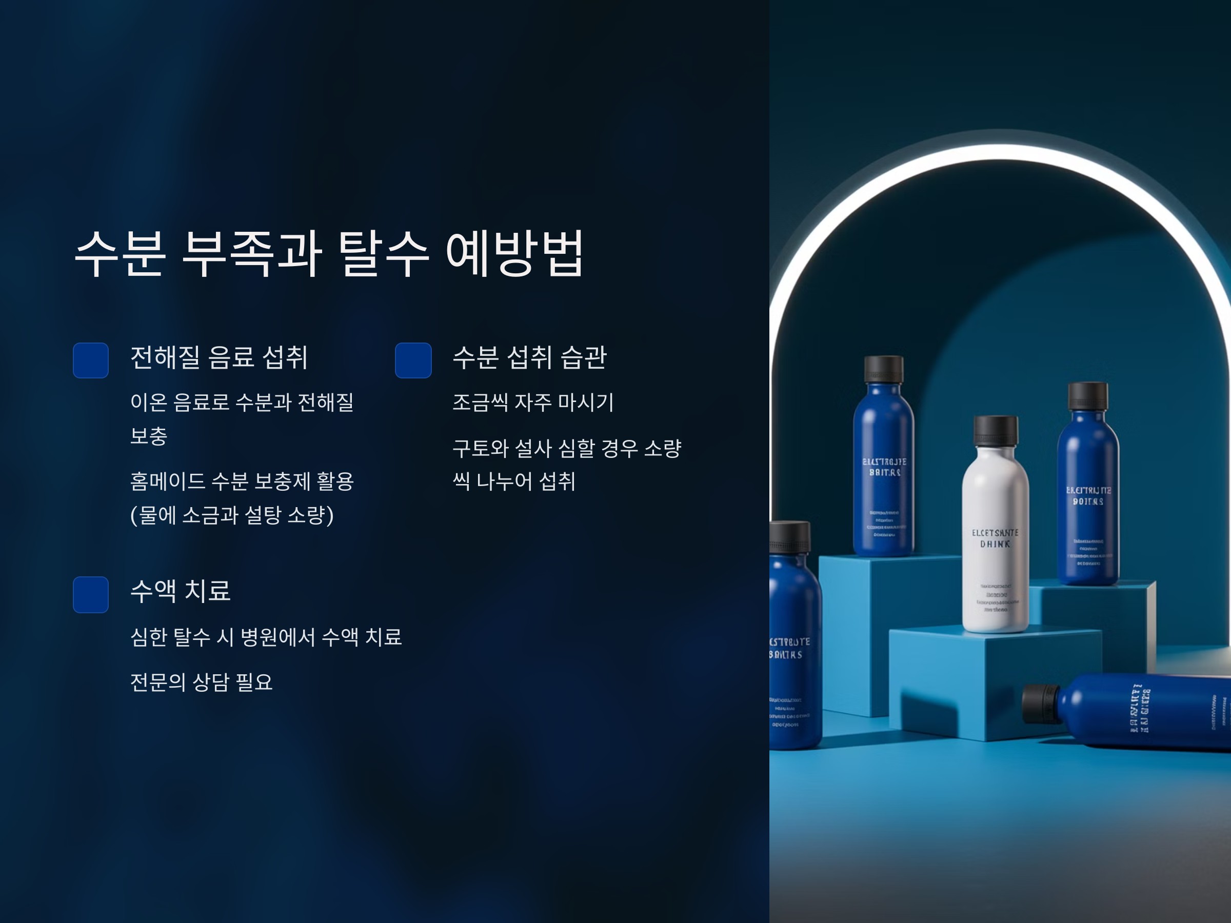 - 구강 건조, 소변량 감소, 심한 피로감 등 탈수 증상이 나타나면 병원에서 수액 치료를 받는 것이 중요합니다.