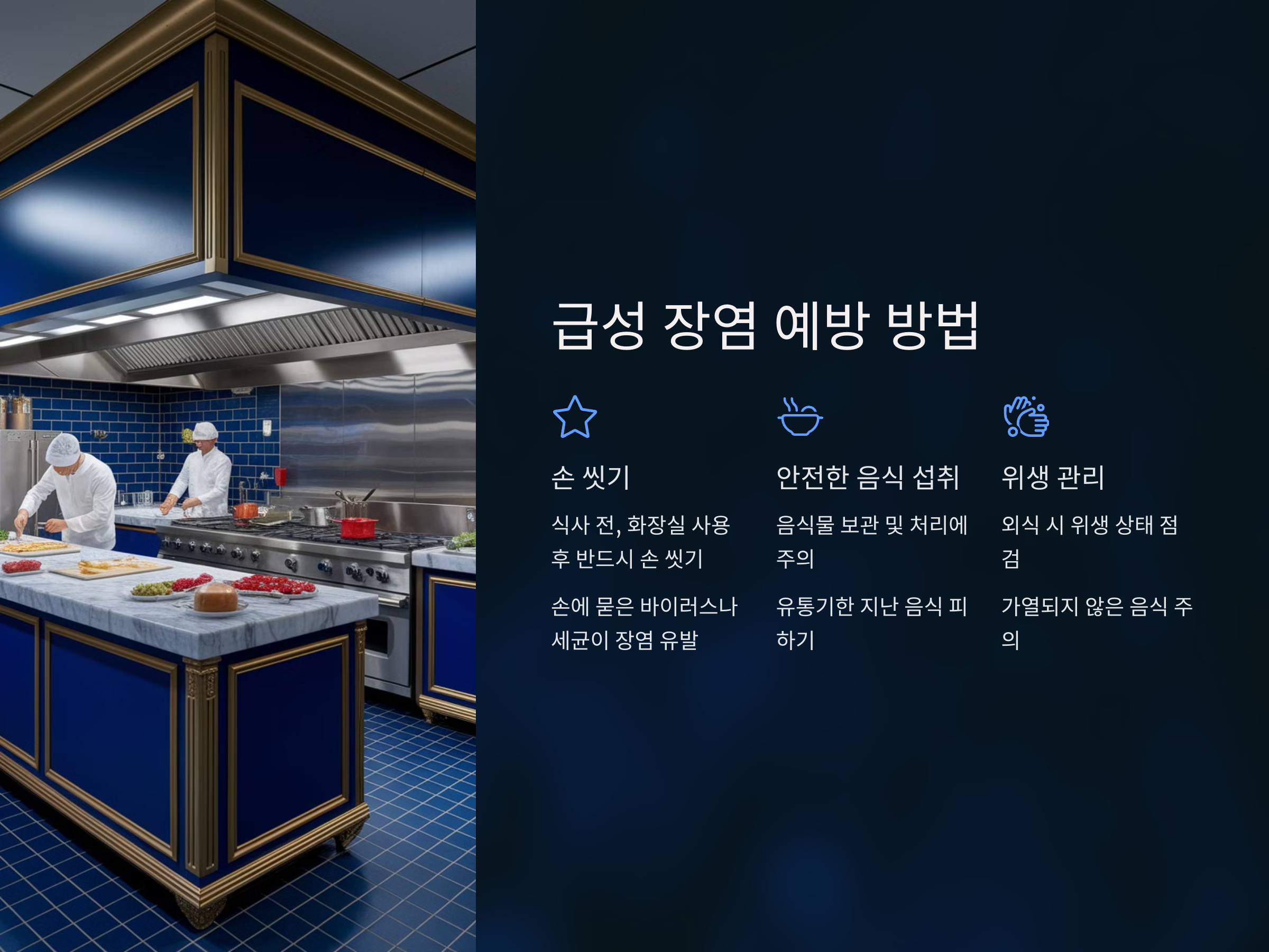 - 식사 전, 화장실 후에는 반드시 손을 씻어야 합니다. 손에 묻은 바이러스나 세균이 장염을 유발할 수 있기 때문에 손 씻기는 가장 기본적인 예방 방법입니다.