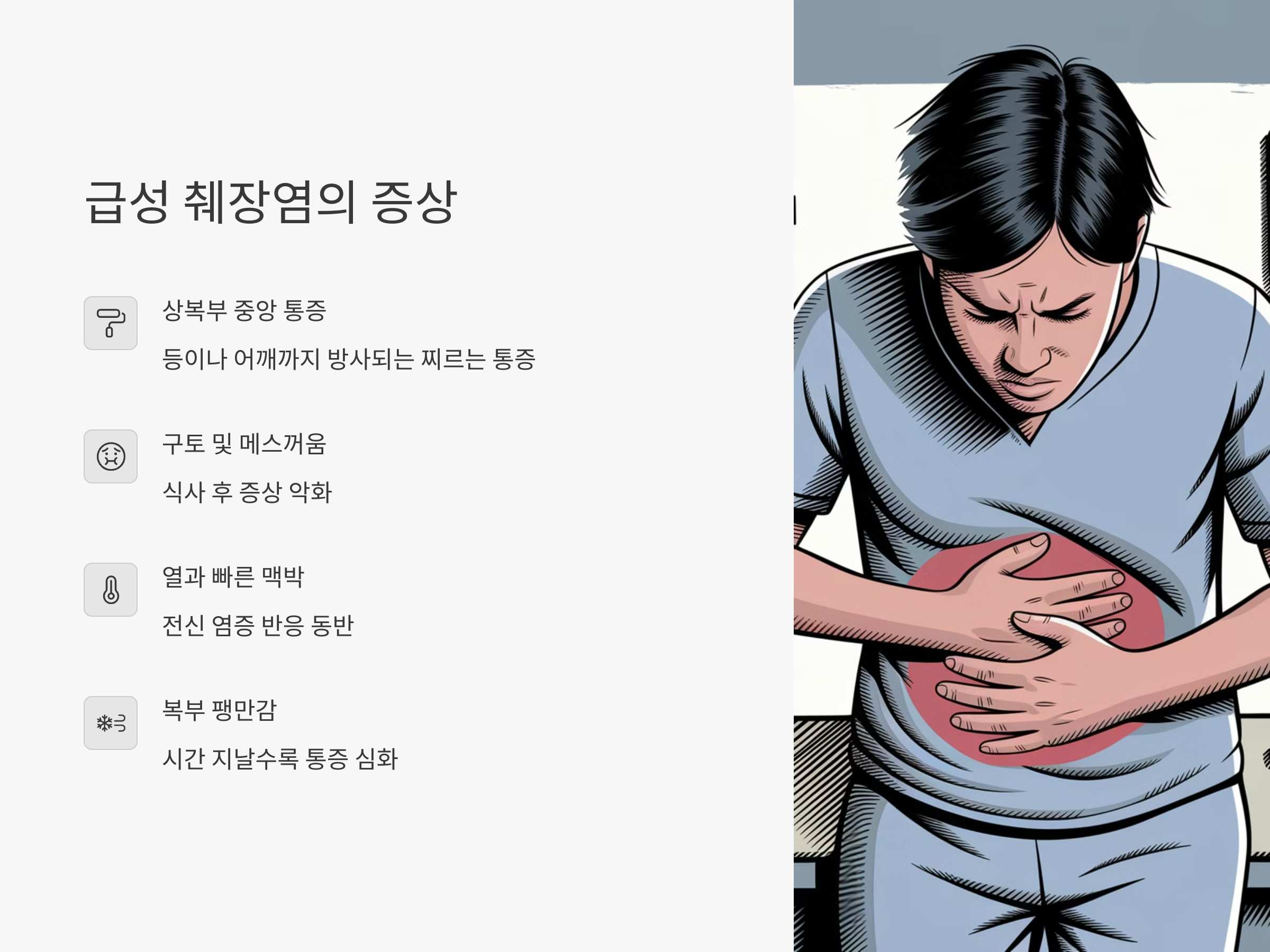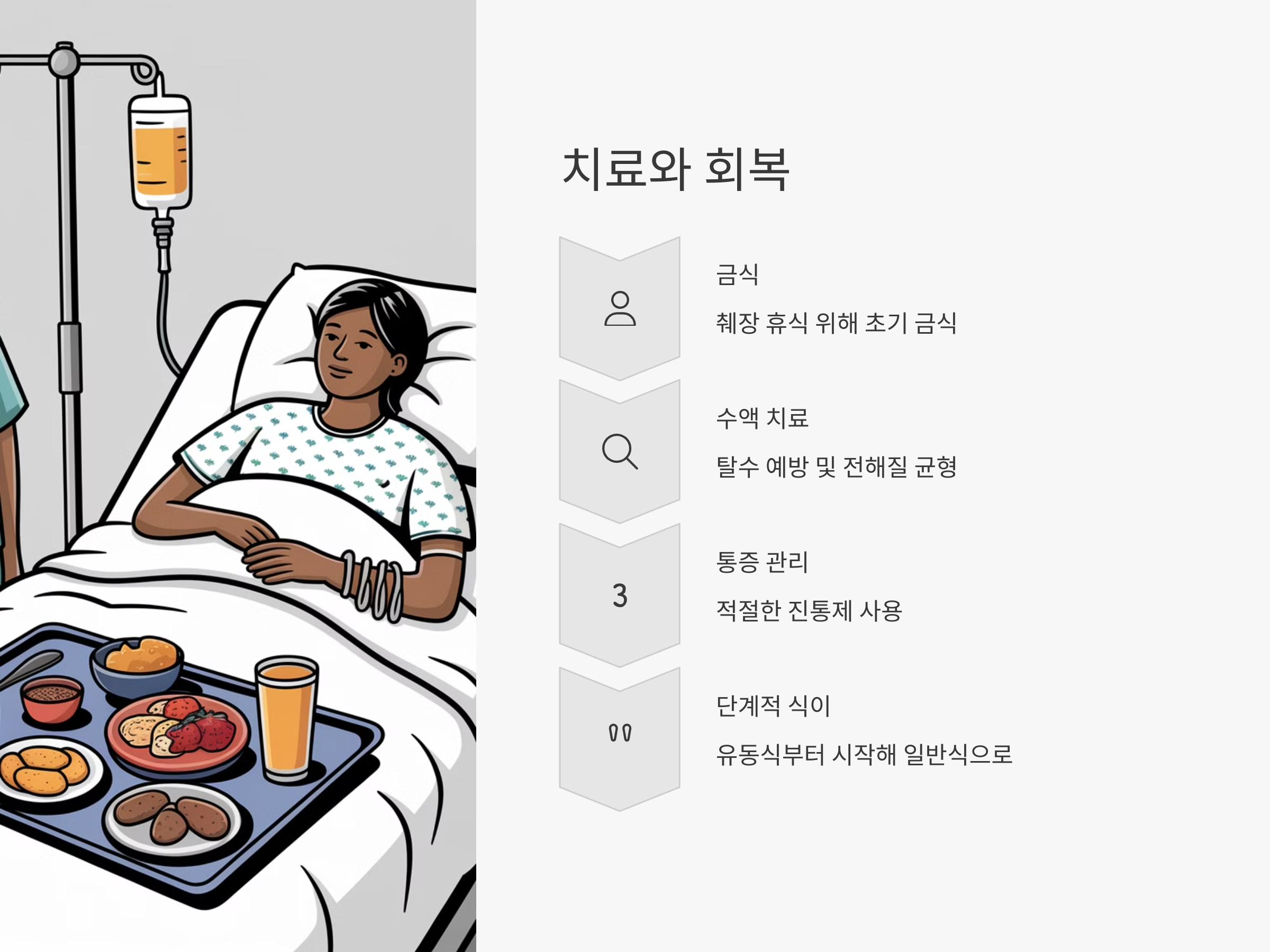 초기에는 단순 복통과 메스꺼움으로 시작하지만, 시간이 지날수록 전신 염증 반응, 호흡 곤란, 혈압 저하, 신장 기능 저하 등으로 이어질 수 있어 반드시 조기에 적절한 치료가 필요합니다.