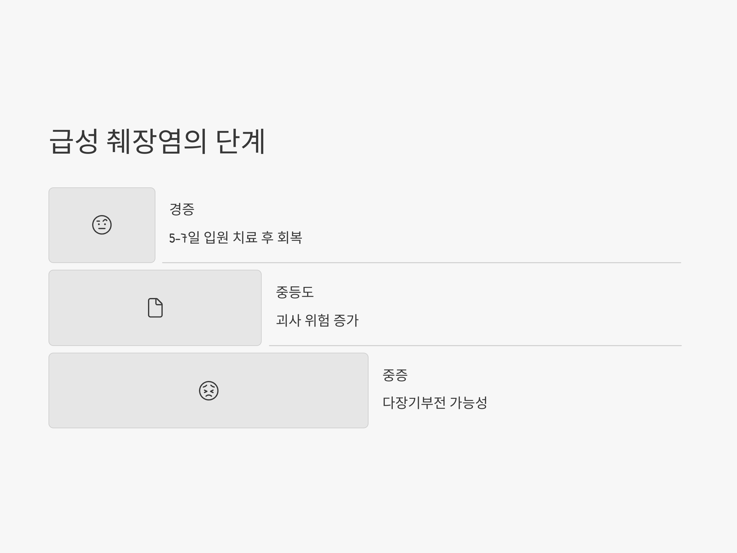 급성 췌장염은 크게 경증, 중등도, 중증으로 나뉘며 각 단계마다 증상과 치료 접근이 다릅니다. 경증은 비교적 빠르게 회복되며 보통 5~7일 정도 입원 치료 후 퇴원할 수 있습니다. 그러나 중등도 이상이 되면 괴사성 췌장염, 출혈, 복수, 다장기부전 등의 위험이 커집니다.
