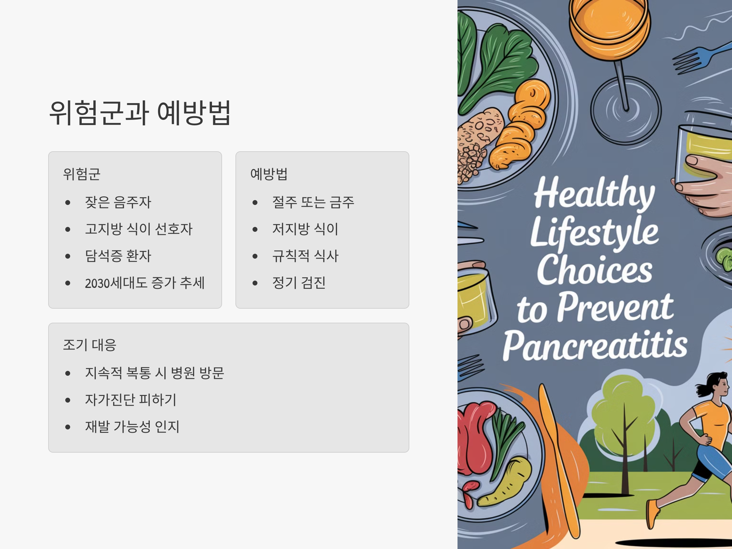 급성 췌장염은 갑작스럽게 췌장에 염증이 생기며, 주로 상복부의 극심한 통증과 메스꺼움으로 시작됩니다. 최근 식습관의 서구화, 음주 증가, 그리고 만성 질환의 유병률이 늘어나면서 발병률이 높아지고 있으며, 특히 평소에는 건강하던 사람에게도 갑작스럽게 찾아올 수 있어 각별한 주의가 필요합니다. 현재 급성 췌장염은 중장년층 뿐 아니라 2030세대에서도 종종 발생하며, 이는 잦은 회식문화, 기름진 음식 섭취와 밀접한 연관이 있습니다. 또한 최근 연구에서는 일부 약물의 부작용, 유전적 요인, 바이러스 감염까지도 원인으로 지목되고 있어 다양한 차원의 예방법이 요구됩니다.