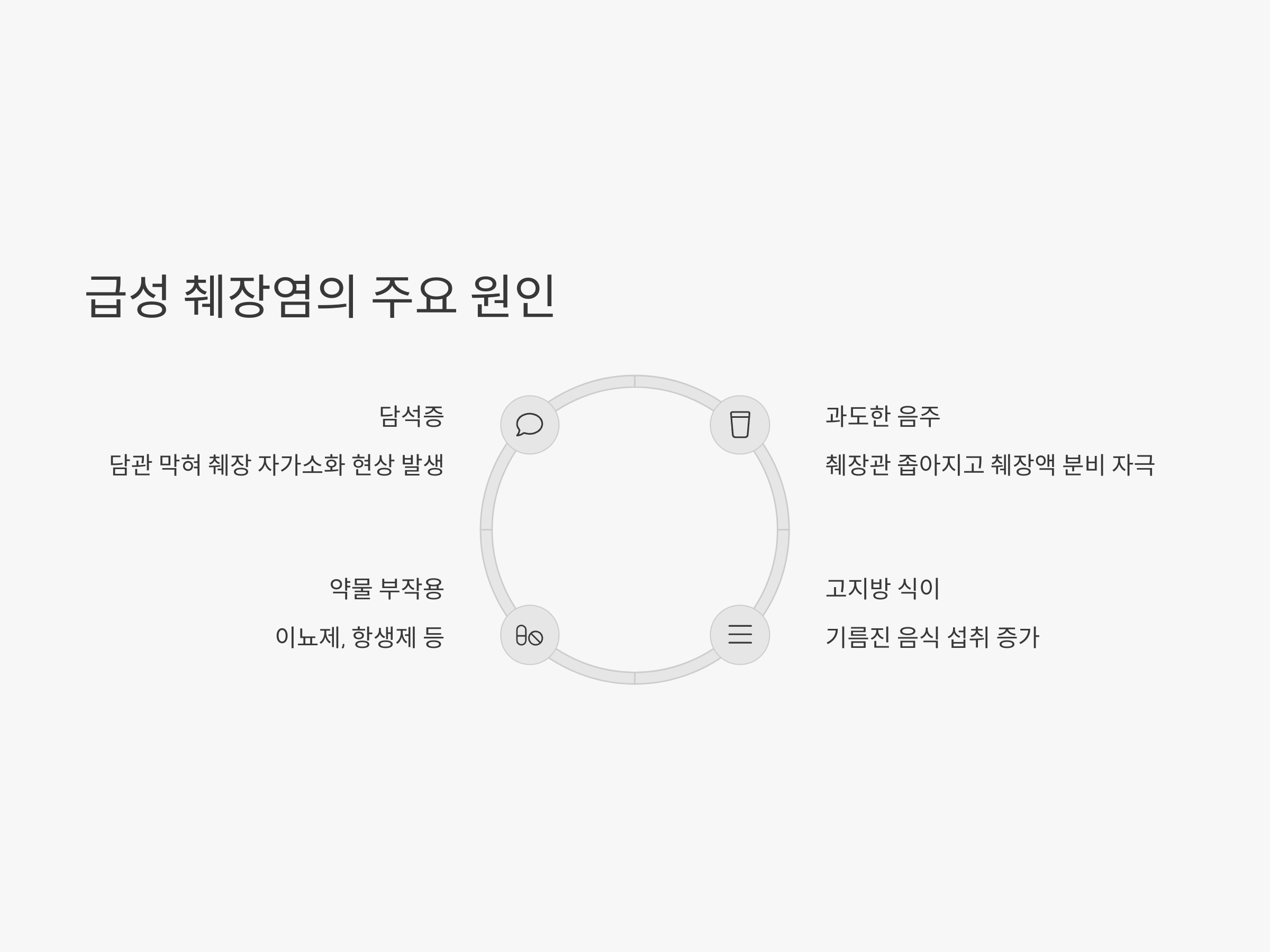 급성 췌장염의 원인은 다양하지만 가장 대표적인 두 가지는 담석증과 지나친 음주입니다. 담석이 췌장으로 향하는 담관을 막게 되면 췌장에서 생성된 소화효소가 역류하여 췌장 자체를 소화시키는 자가 소화 현상이 발생할 수 있습니다. 이는 급성 염증의 직접적인 원인이 됩니다.
