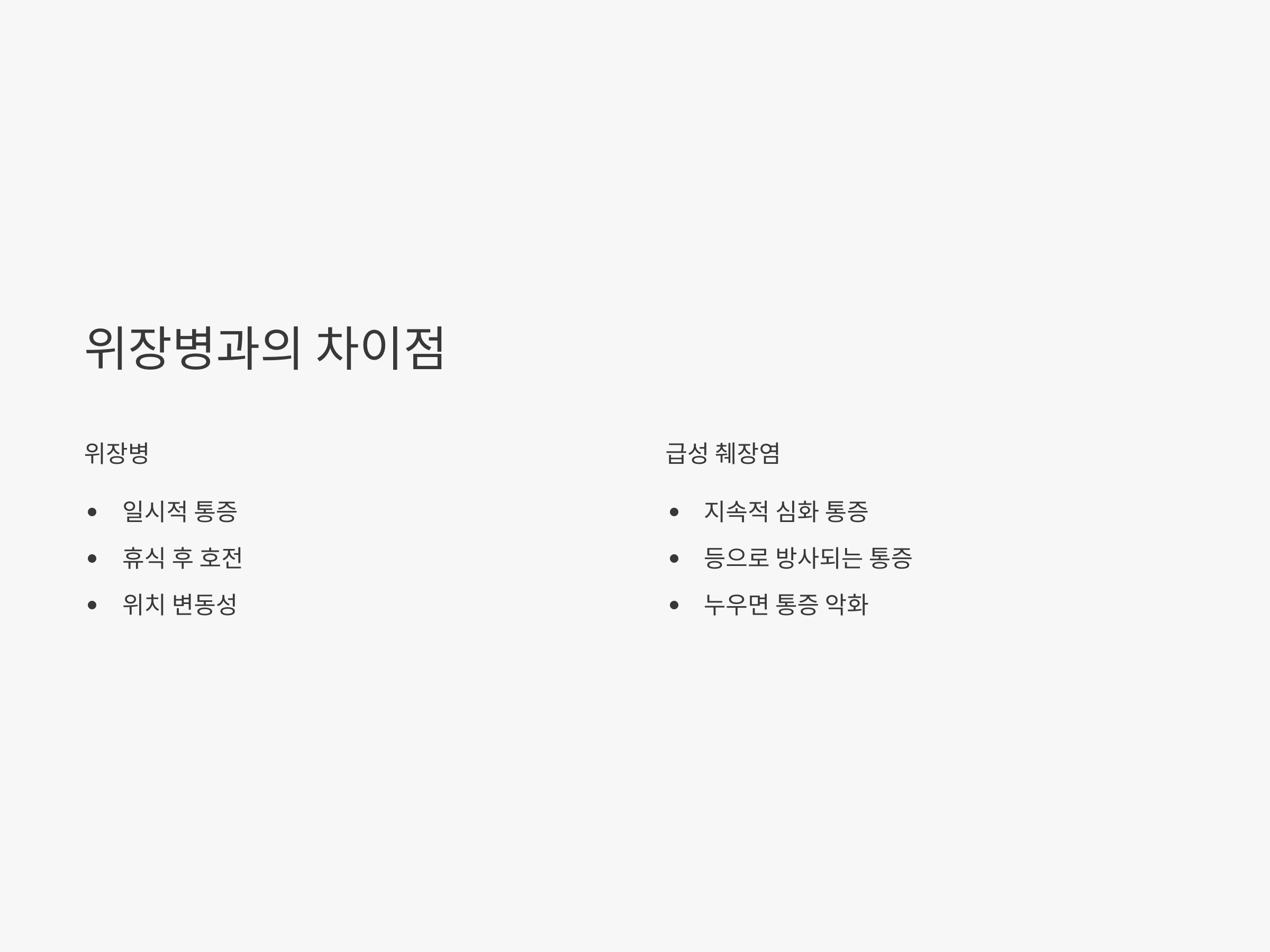 일반적인 소화불량이나 위염 증상과 헷갈리기 쉬우나, 급성 췌장염은 시간이 지날수록 통증이 더 심해지는 특징이 있습니다. 따라서 단순한 위장 질환으로 착각하고 방치하면 상태가 급격히 악화될 수 있으므로 주의가 필요합니다.