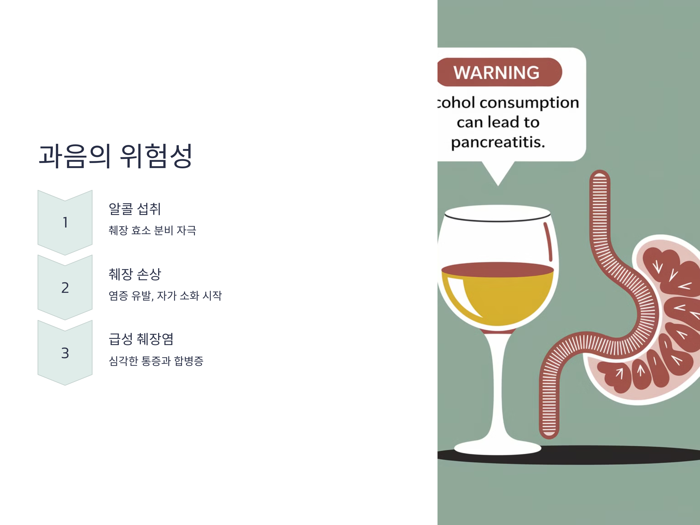 과음은 급성 췌장염의 가장 큰 원인 중 하나입니다. 지속적인 과음은 췌장에 염증을 유발하며, 알콜이 췌장의 효소 분비를 자극해 췌장이 자가 소화하는 과정으로 이어집니다. 장기적으로 과도한 알콜 섭취는 췌장의 세포를 손상시키고 염증을 일으켜 급성 췌장염을 유발할 수 있습니다.