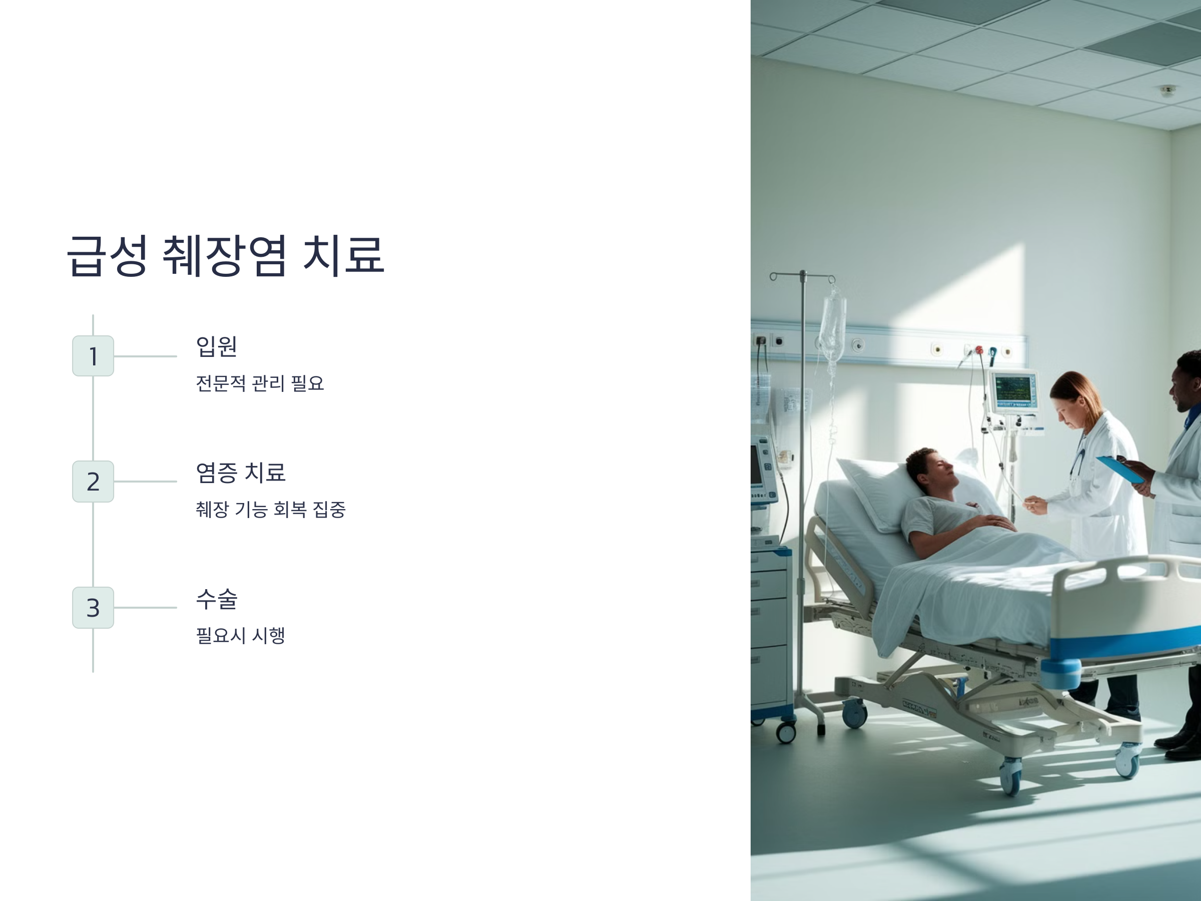 급성 췌장염은 치료가 필요하며, 병원에서의 전문적인 관리가 중요합니다. 치료는 주로 입원하여 췌장의 염증을 치료하고, 췌장의 기능을 회복하는 데 집중합니다. 경우에 따라 수술이 필요할 수도 있습니다. 급성 췌장염이 심해지면 합병증이 발생할 수 있으므로, 빠른 치료가 중요합니다.