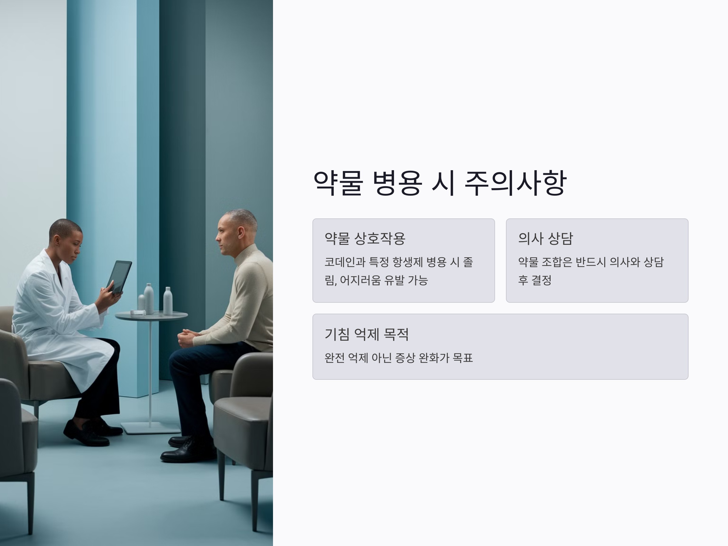 기침 억제제와 항생제를 병용할 경우 약물 상호작용이 발생할 수 있습니다. 예를 들어, 코데인과 특정 항생제는 중추 신경계에 영향을 미쳐 졸림, 어지러움 등의 부작용을 일으킬 수 있습니다. 의사의 지시에 따라 약물을 사용하는 것이 중요합니다.