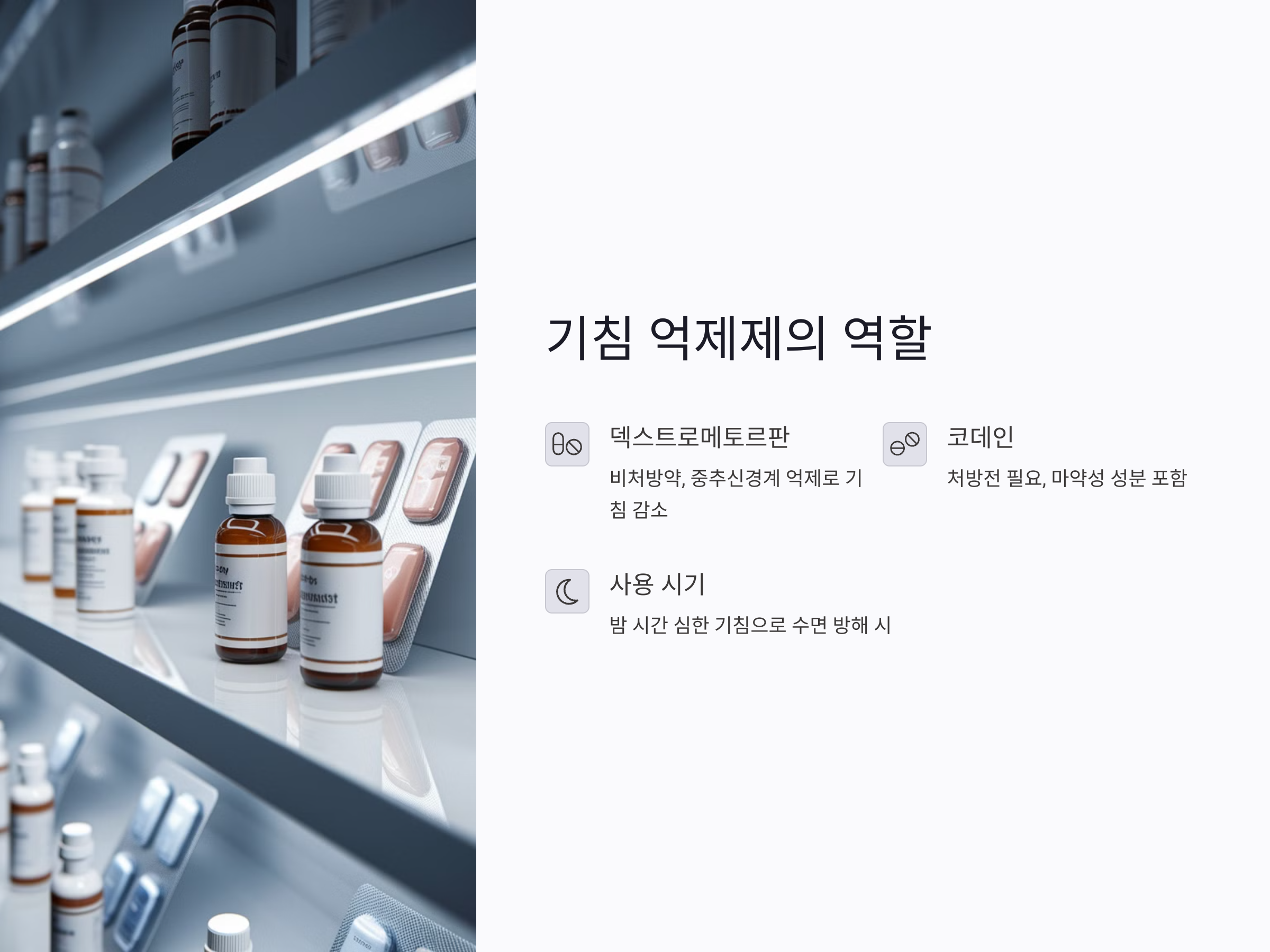- 기침 억제제는 주로 밤에 기침으로 인해 수면에 방해가 되는 경우 사용합니다. 그러나 장기간 사용은 피하고, 기침의 원인을 파악하는 것이 중요합니다.