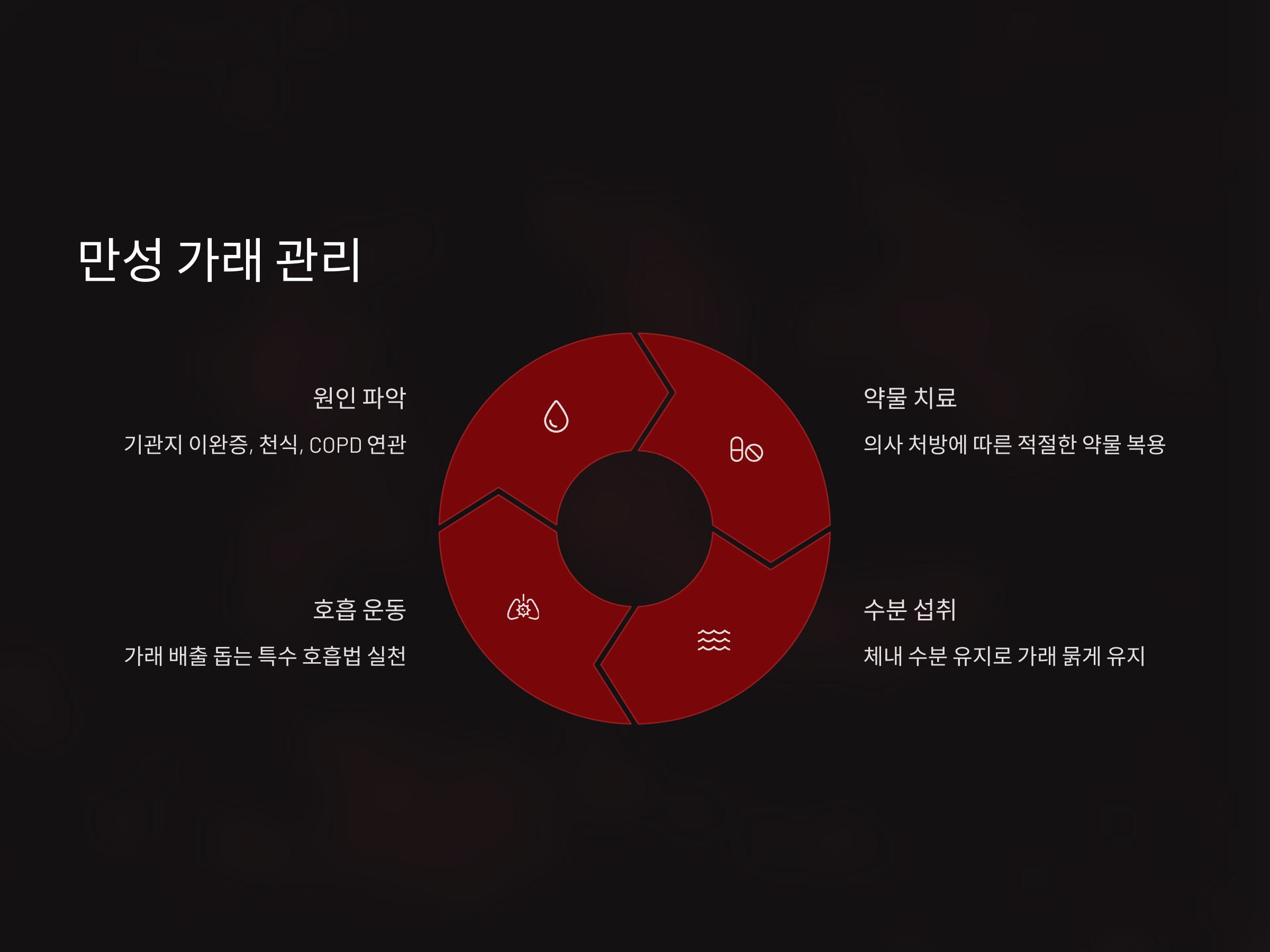 만성 가래를 관리하기 위해서는 우선 원인을 파악하는 것이 중요합니다. 이는 보통 기관지 이완증, 천식, COPD(만성폐쇄성폐질환) 등 호흡기 질환과 관련이 있습니다. 적절한 약물 치료와 함께, 체내 수분을 충분히 섭취하고, 가래를 배출하기 위한 호흡 운동을 병행하는 것이 도움이 됩니다.